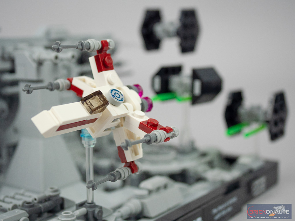 Étant donnée l’échelle retenue, les 4 vaisseaux (le X-Wing « Red Five », les deux chasseurs TIE et le TIE Advanced piloté par Dark Vador himself) sont également réussis. On notera cependant que les ailes du X-Wing ne peuvent pas plus se replier qu’elles ne le sont déjà. Remarquez également la petite tile ronde tampographiée qui vient habilement remplacer R2-D2 à l’arrière du cockpit. Les verrières des TIE sont également tampographiées, avec une pièce déjà vue dans le set 75315 Imperial Light Cruiser.