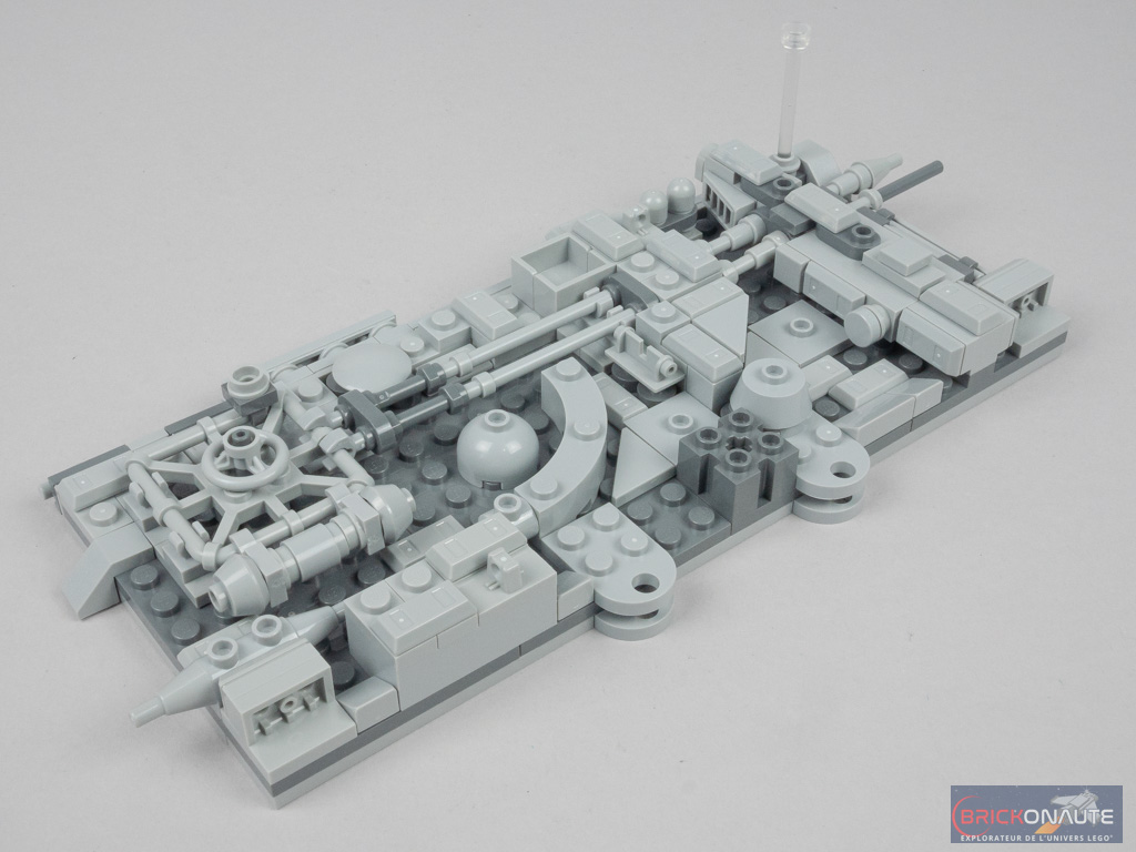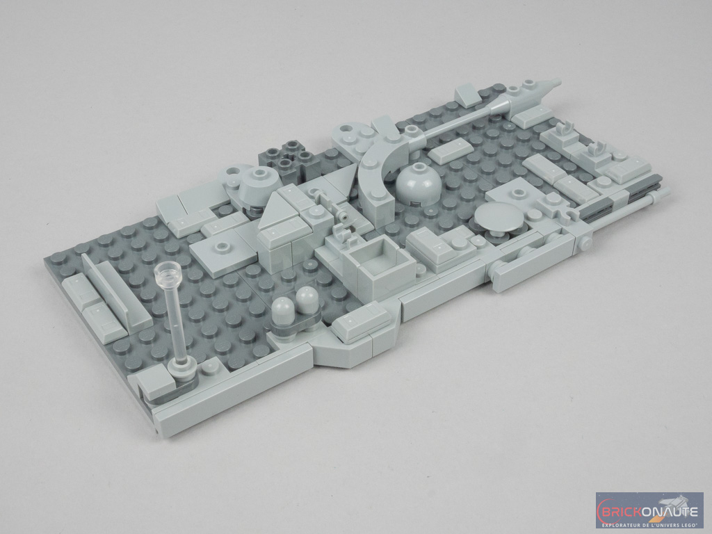 La construction est globalement simple même s’il faudra être minutieux. On assemble d’abord le support d’exposition, avant de le décorer de nombreux greebles, puis on s’occupe de la paroi verticale sur le même principe. Une fois cette dernière décorée, on l’attache à la base avec deux axes Technic, puis on construit les 4 mini vaisseaux fixées sur des tiges transparentes.