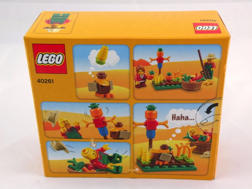 L’avant de la boîte nous montre les différentes mini-constructions auxquelles nous aurons droit avec ce set : deux minifigs (un fermier et sa fille), un récipient plein de fruits et légumes, un jardin potager avec un épouvantail, une dinde, une charrette, et enfin un arbre avec un oiseau posé au sommet. Il ne manque que la mention « suggestion de présentation ». En haut à droite, une citrouille avec des lignes permettant d’inscrire quelques mots. Sur l’arrière, une sorte de mini-bande dessinée dans laquelle un oiseau mal intentionné s’en prend au potager du fermier, en faisant tomber l’épouvantail sur ce dernier, le précipitant au milieu de sa récolte. On remarque d’ailleurs que sur la dernière vignette, l’épouvantail s’est miraculeusement relevé. A l’intérieur, 3 sachets de pièces toutes plus colorées les unes que les autres.