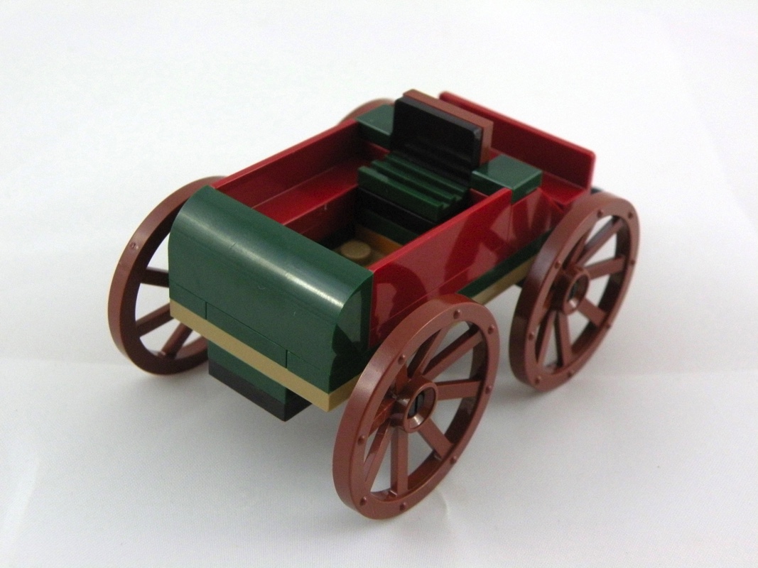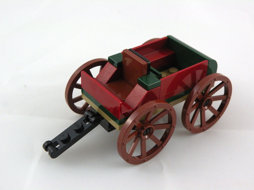 Viennent ensuite les deux « gros » assemblages de la boîte, à commencer par la charrette. C’est vraiment bien fait, et le choix des couleurs est vraiment bien réfléchi : un mélange de dark red, de dark green, et de reddish brown. Elle roule, mais on se demande bien qui la tire. Un cheval aurait pu être bienvenu.