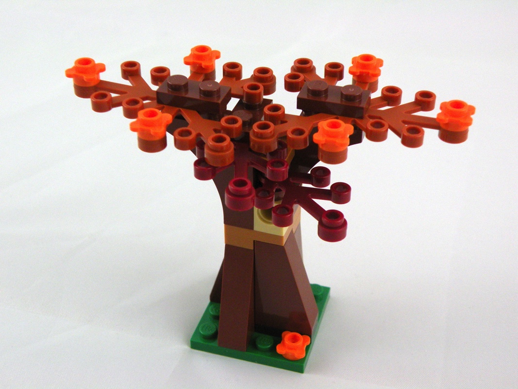 On termine donc cet ensemble avec l’assemblage de l’arbre aux couleurs automnales, ou l’on retrouve même un petit trou (réalisé avec une brique Technic) dans lequel un oiseau pourra se nicher. Ici encore, un beau mélange de couleurs, agrémenté de jolies fleurs oranges.