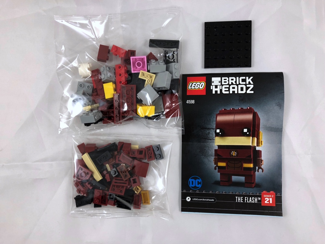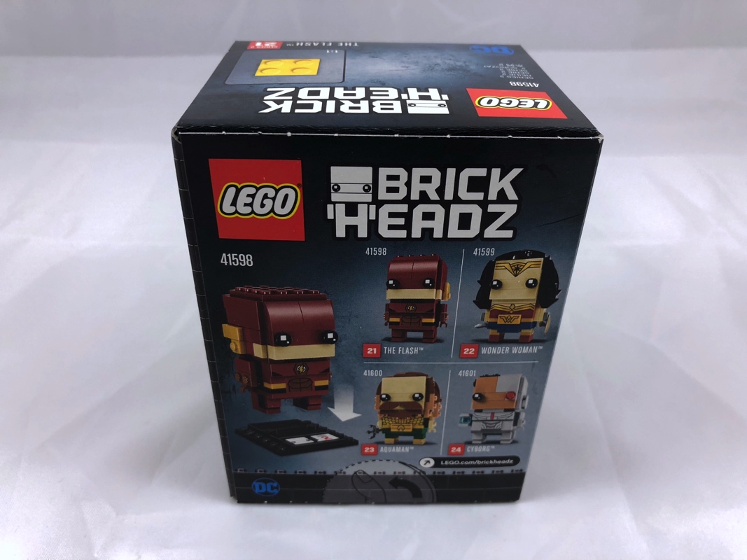 Format standard pour une boîte de cette gamme, elle porte le n°21 dans le coin inférieur droit sur sa face avant. On y retrouve évidemment notre modèle, sur un fond gris-bleu, le logo DC Comics, et le rappel qu’il fait partie de la deuxième série BrickHeadz. Sur le côte, contrairement à d’habitude, pas de photo du personnage « réel » mais simplement le logo du Flash (l’éclair) au dessus du nom du film. Sur l’arrière, il est présenté sur son socle et aux côtés de ses petits copains de la Justice League : Wonder Woman (41599), Aquaman (41600) et Cyborg (41601).