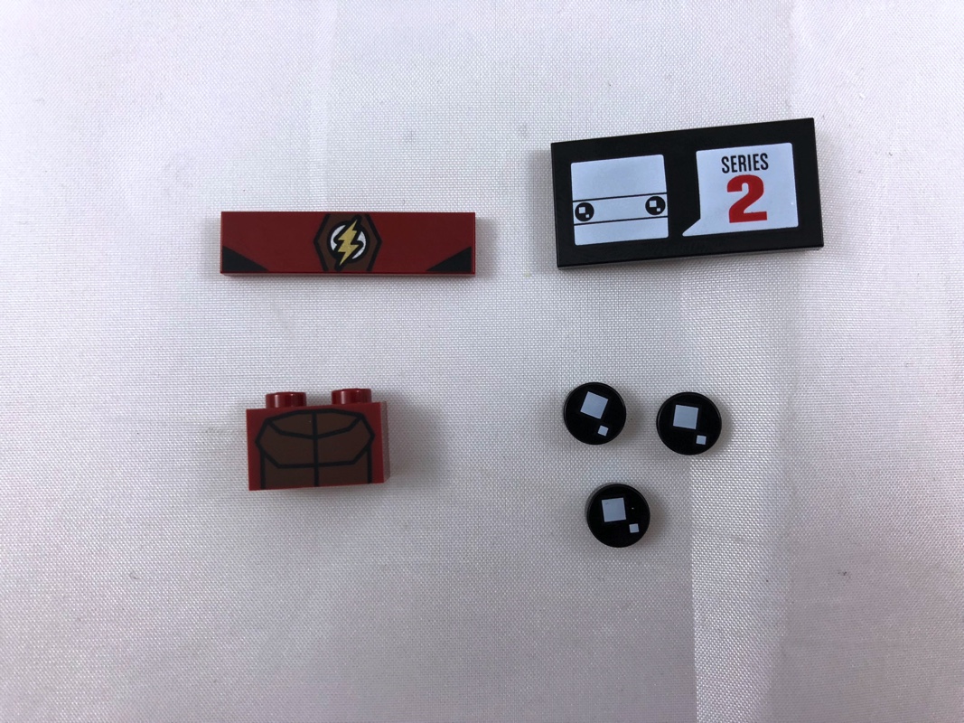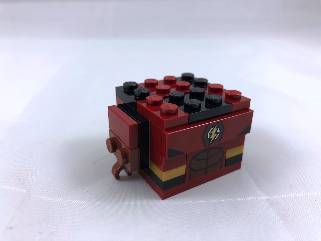 On termine en ajoutant les deux jambes, mieux travaillées que d’habitude puisque décorées d’une tile sur le devant à la manière de ce qu’on a pu voir sur Finn (41485) (les côtés des jambes de ce dernier sont également décorés, pas ceux de notre Flash). Vient enfin le temps de poser le Flash sur son socle d’exposition, avec sa tile signalétique.