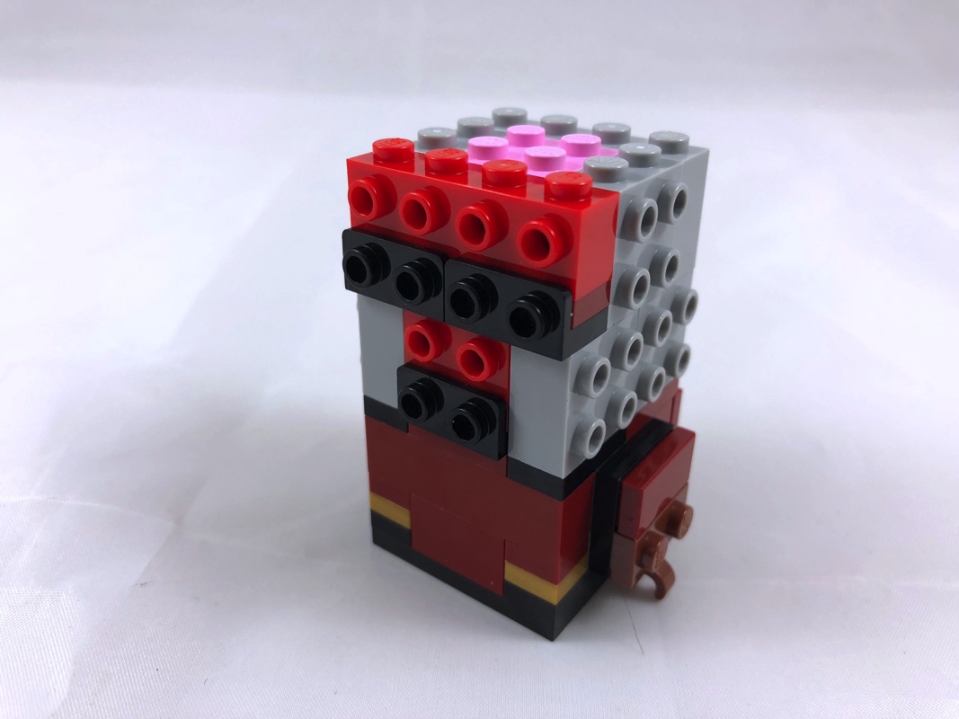 On commence par assembler le torse, sur lequel on notera la présence d’un liseré noir et pearl gold apportant un joli contraste dans l’ensemble essentiellement composé de dark red. On ajoute les bras habituels de la gamme, composés d’une plate 2×2 sur laquelle prend place une tile et un autre plate avec un clip en guise de main. Ce sont d’ailleurs les seules pièces marron de l’ensemble, représentant les gants du personnage.