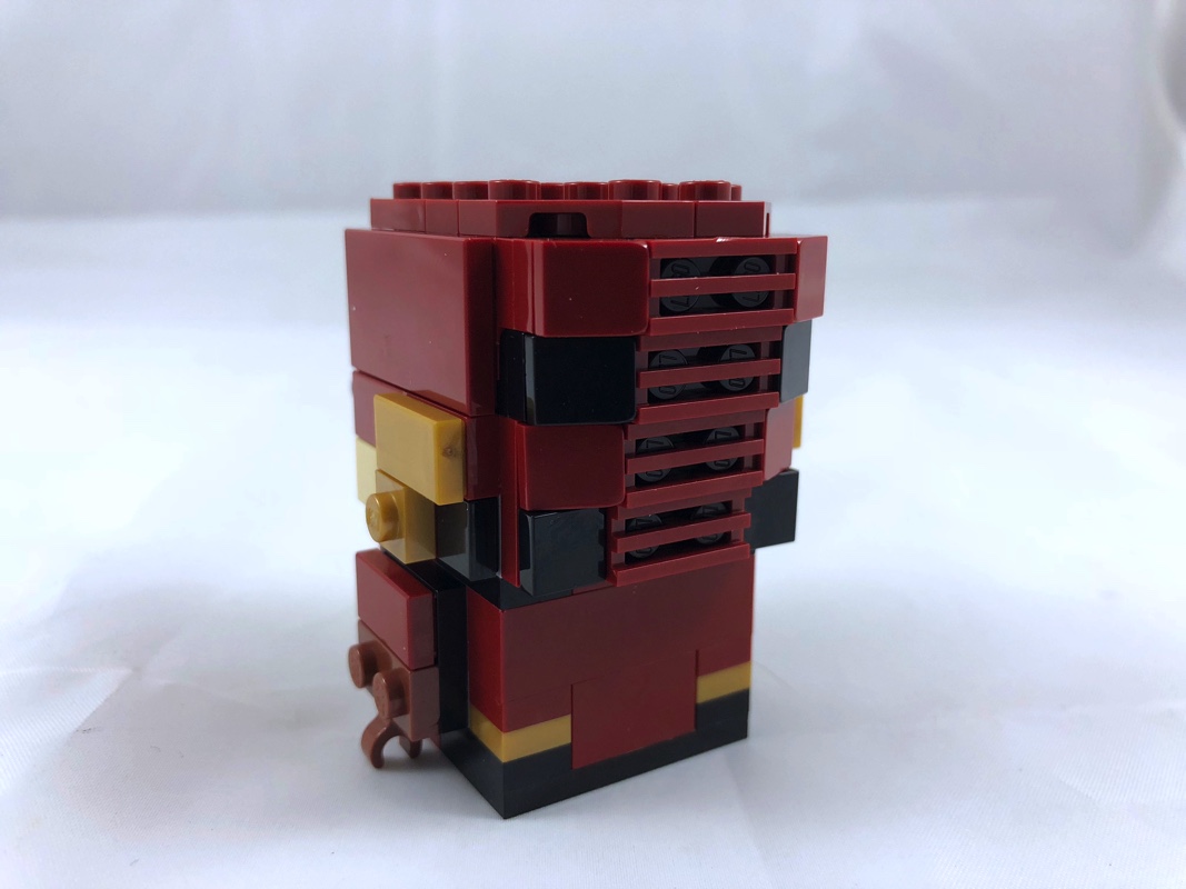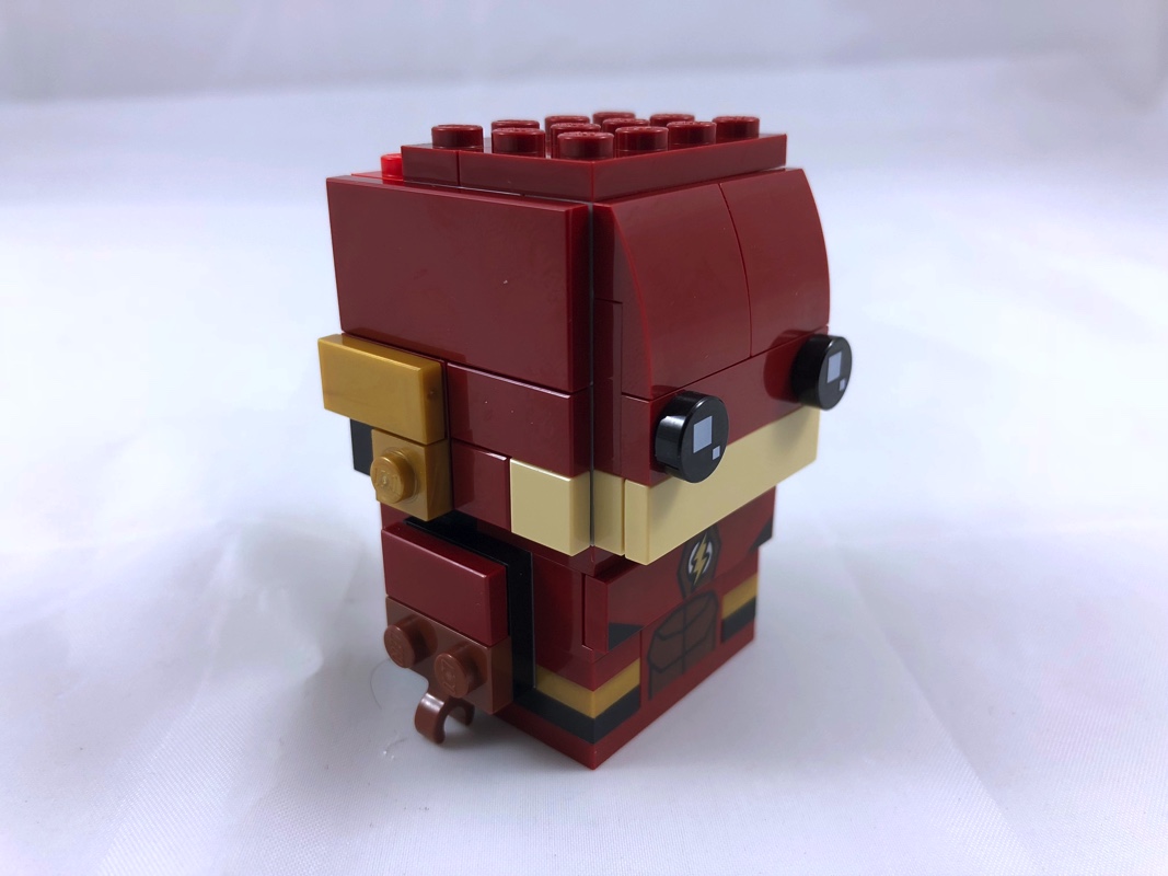 Vient ensuite la construction de la tête. On trouve ici une petite variation par rapport aux six faces habituellement composées de pièces SNOT. C’est toujours le cas ici, mais sur la partie arrière ces pièces sont décalée entre elles de l’épaisseur d’un tenon, et ce sur 4 hauteurs. Cela permet une fois l’habillage fait de donner cette impression de mouvement au personnage, c’est malin. Contrairement à Captain America (41589), qui porte une cagoule tout comme le Flash, le front de ce dernier n’est pas désespérément plat mais composé de deux pièces bombées qui rendent nettement mieux. Une bande couleur tan et deux joues de cette même couleur constituent la partie basse du visage. Sur les côtés, des pièces en pearl gold représentent les motifs d’éclairs situés sur les oreilles du personnage original.