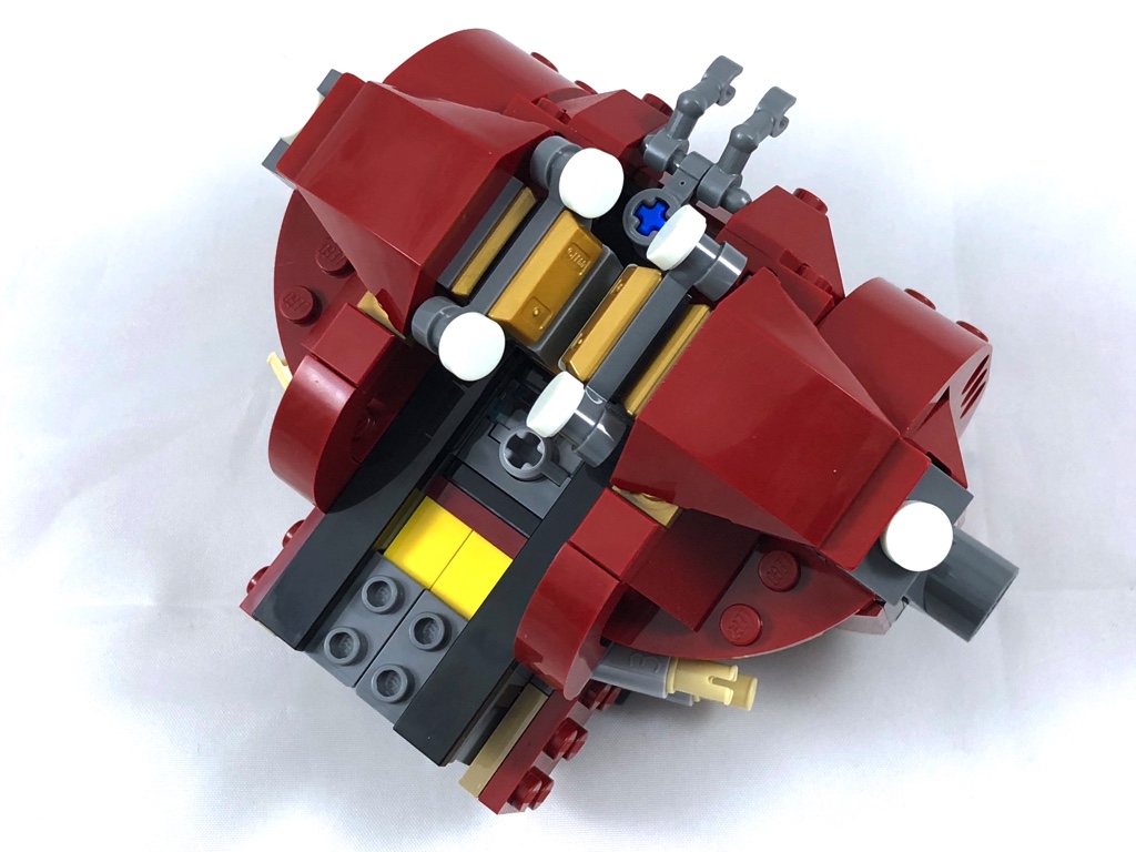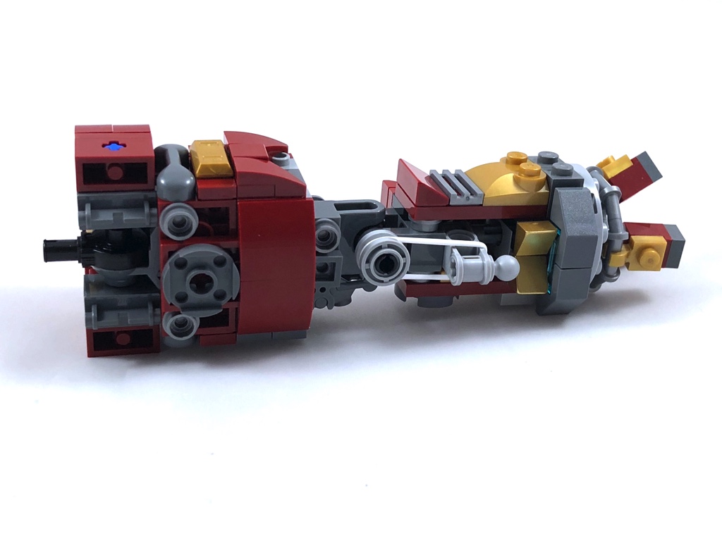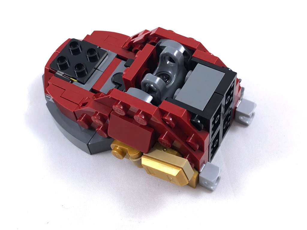 Le deuxième sachet commence par l’habillage des deux côtés du torse, puis de l’avant de celui-ci, toujours grâce à un subtil mélange de pièces en dark bluish gray, dark red et pearl gold. Mention spéciale à la ceinture, ces pièces clipsées autour de la taille sont du plus bel effet. On termine la construction du torse avec l’ajout de l’arrière de ce dernier, articulé sur une charnière, qui permet de se servir de l’interrupteur de la light brick. On termine cette deuxième série de sachets avec l’ajout de la taille, articulée sur une turntable, qui permet donc d’orienter le torse du Hulkbuster comme on le souhaite.