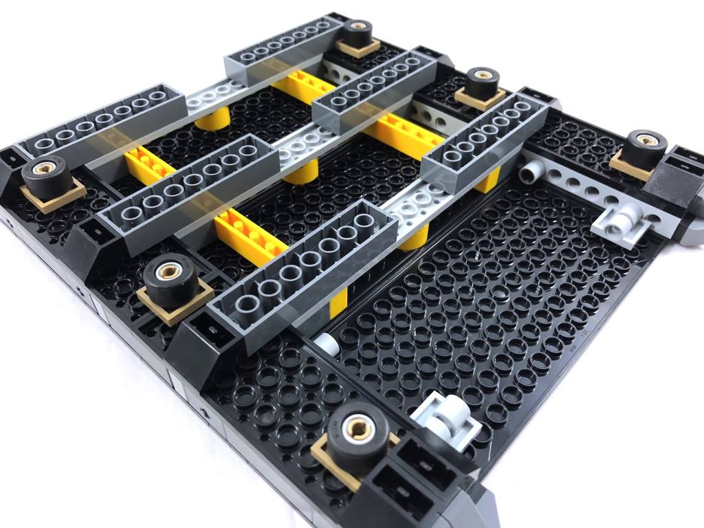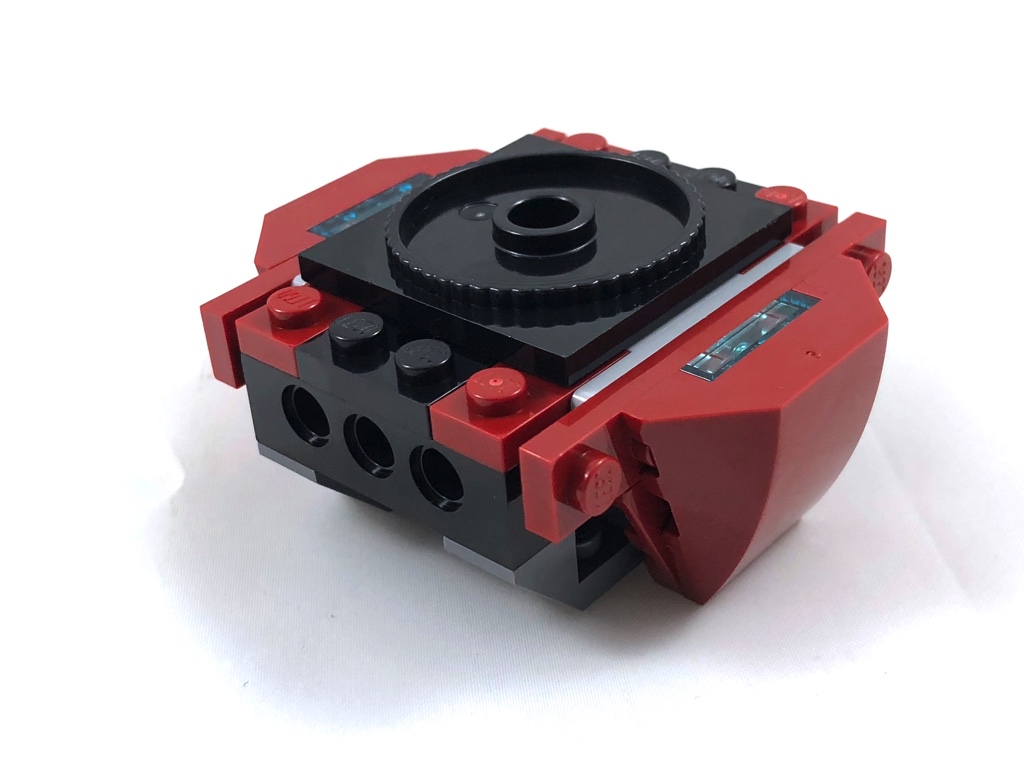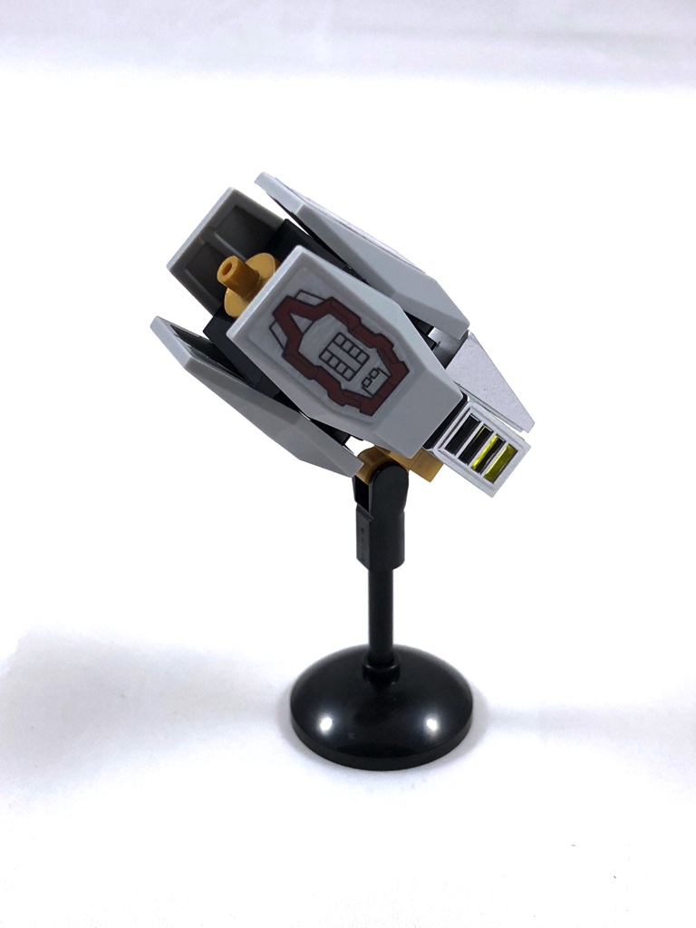 Si vous avez bien suivi, il ne reste plus qu’à assembler le socle et ses divers accessoires. On commence par assembler un mini-roadster, composé de 9 pièces. On continue avec la construction du socle proprement dit, construit sur une armature de pièces Technic couverte de tiles noires, dont 3 grandes. C’est à ce moment qu’intervient l’étape redoutée des amateurs de ces modèles type « UCS » : l’ajout de l’autocollant avec les caractéristiques de l’engin sur la tile qui lui est dédiée. N’hésitez pas à consulter le petit guide d’application des autocollants LEGO que je vous ai concocté à cet effet. A noter que la tile « signalétique » est articulée par rapport au socle, et peut donc aussi bien être mise à plat qu’inclinée, si le modèle est exposé en hauteur. Autre bonne idée de ce socle : il est posé sur 6 supports en gomme, qui lui évitent de glisser sur votre étagère.