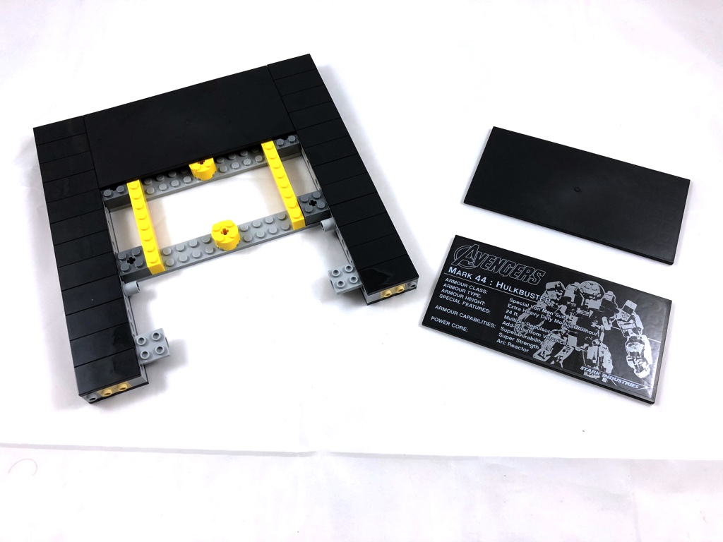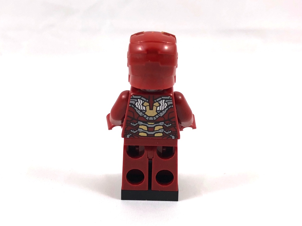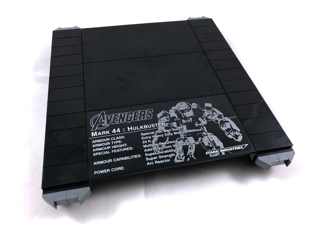 L’armure reste cependant très soignée, avec une tampographie des différents éléments mélangeant le blanc, le gris et l’or, et ce de manière très détaillée. Petit point d’amélioration à mon goût : on aurait aimé que les bras soient également tampographiés. Le casque est en deux parties, et vient se refermer sur l’avant du visage comme on peut le voir dans les différents films de la saga. La minifig repose sur un socle (en fait un simple bracket noir) décoré d’une slope noire avec un sticker. Etant donné le soin apporté au socle du Hulkbuster, on aurait pu attendre un peu plus d’égard de LEGO envers cette minifig, qui plus est exclusive comme le mentionne fièrement la boîte du set.