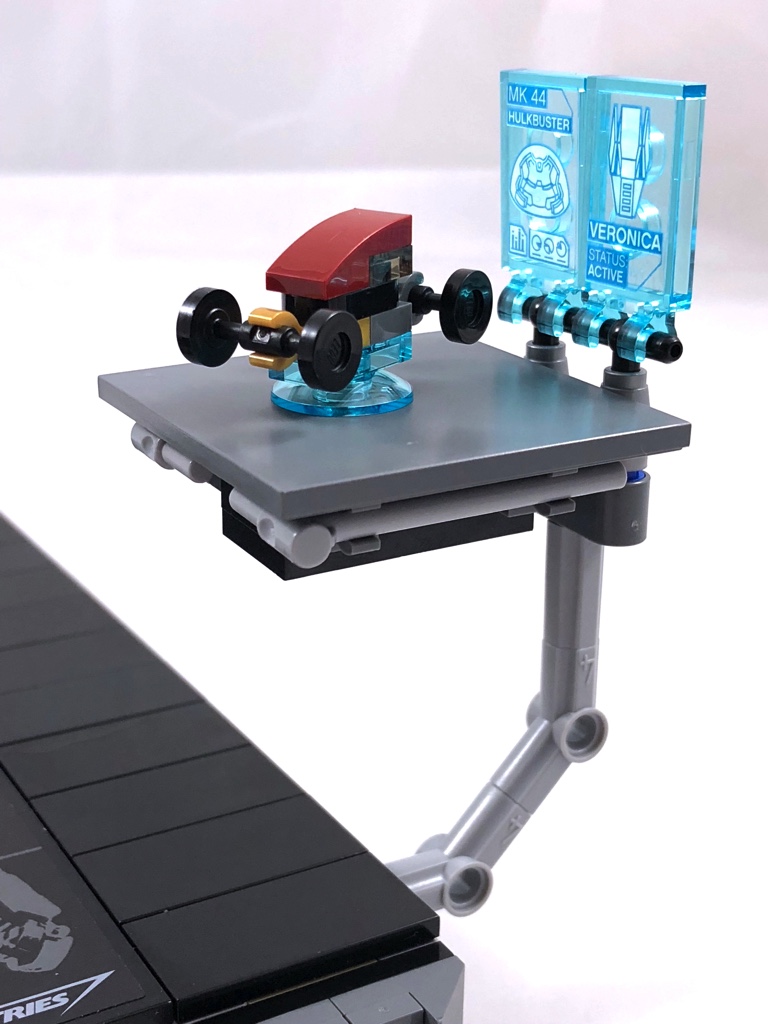 Notre Hulkbuster est mis en scène dans ce qu’on imagine être le laboratoire de Tony Stark, on distingue quelques appareils dans l’arrière plan. Les bras robotiques sont manifestement occupés à réparer la bête, quelques étincelles s’en échappent. Le Hulkbuster est présenté debout, les jambes légèrement écartées, le poing gauche ouvert laissant apparaître ce qu’on pourrait croire être une lumière, mais qui s’avérera en fait être une round tile phosphorescente. En revanche, la lumière qu’on aperçoit sur son torse (son réacteur ARK) est bien réelle puisqu’une brique lumineuse fait partie de l’inventaire. Le modèle est sur son socle noir, avec la tile signalétique habituelle des modèles type « UCS ». Quelques accessoires décorent le tout : un bureau avec une voiture miniature, un satellite Veronica, et un extincteur. Enfin, on aperçoit dans le coin inférieur droit la minifig exclusive fournie dans la boîte, Iron Man MK43, sur son socle.