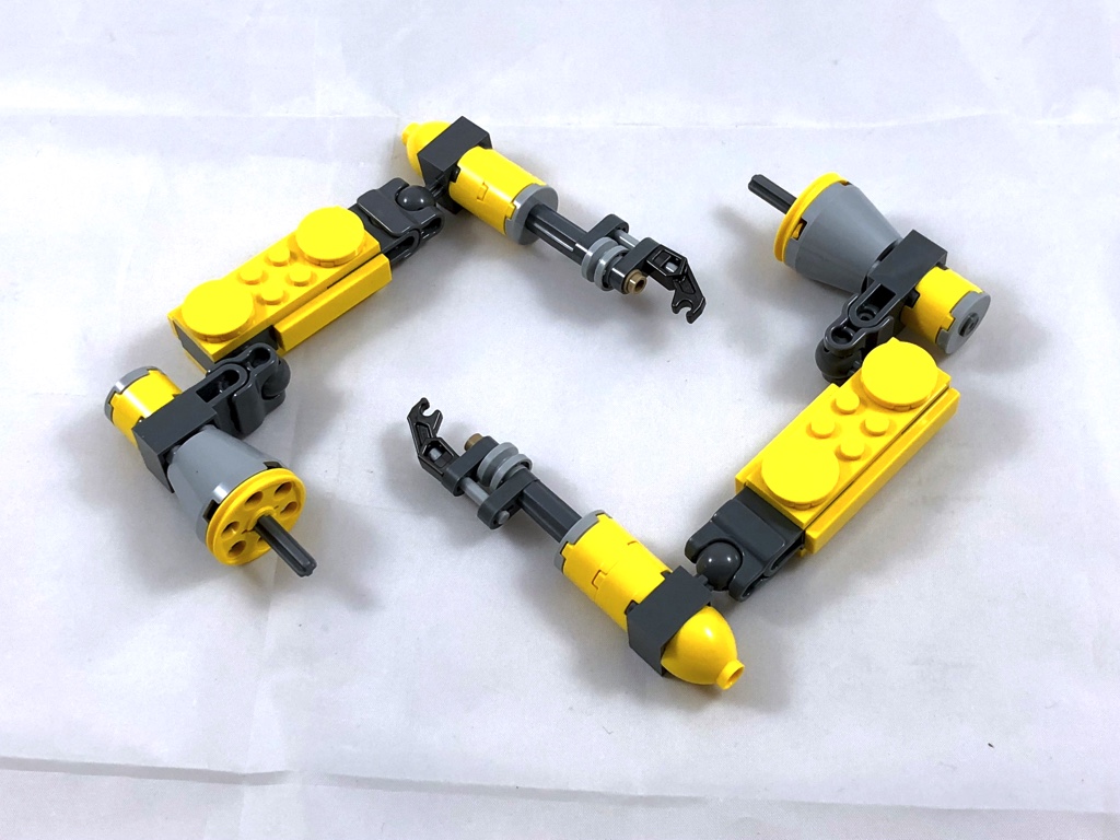 Les quatrième et cinquième sachets vont nous permettre de construire chacun un des ensembles jambes – pieds du modèle. La quatrième commence par la construction d’un extincteur, relativement basique dans sa conception. Vient ensuite l’assemblage du pied, puis de la jambe articulée avec ce dernier à l’aide d’un ball joint. Deux boules plus petites au niveau de la jonction jambe – pied viennent servir de butée et limiter l’angle atteignable. Une petite tile phosphorescente est présente au niveau du genou. On ajout ensuite la jambe sur l’axe Technic laissé en attente au niveau de la cuisse. On assemble ainsi la jambe gauche, puis la jambe droite du Hulkbuster.