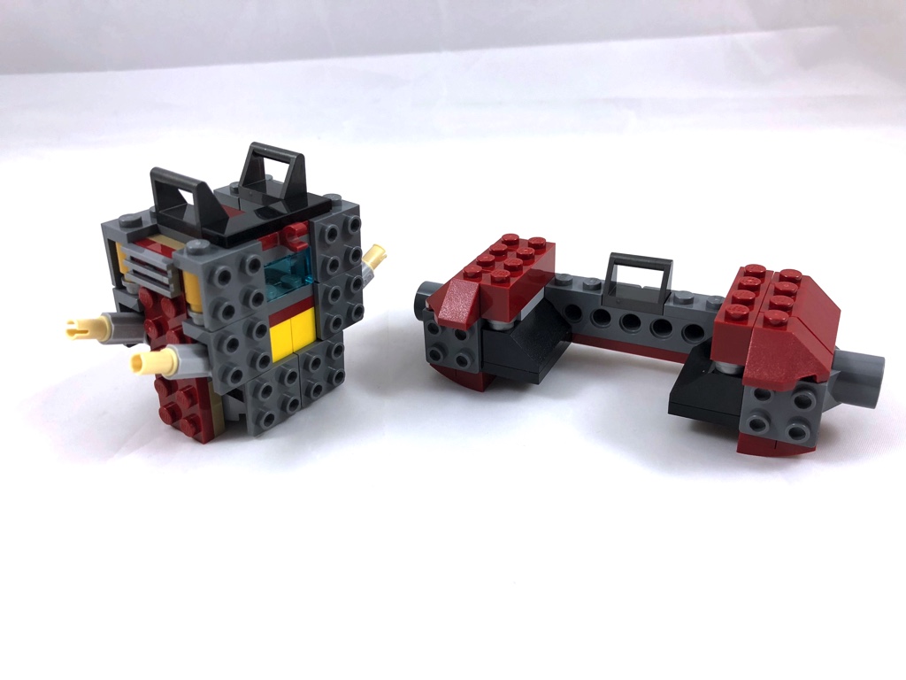 Viennent enfin les différents accessoires à adjoindre au socle. On ajoute ainsi deux écrans d’ordinateur en trans-blue décorés chacun d’un sticker, avant de construire les deux bras robotiques articulés chacun à l’aide de deux ball joints, qui permettent de leur donner la position que l’on souhaite. Il est possible de fixer ces différents accessoires en 8 points différents, 4 de chaque côté du socle. On termine le modèle par la construction d’un bras gauche standard, identique au bras droit préalablement assemblé, et donc interchangeable avec le bras « marteau-piqueur ».