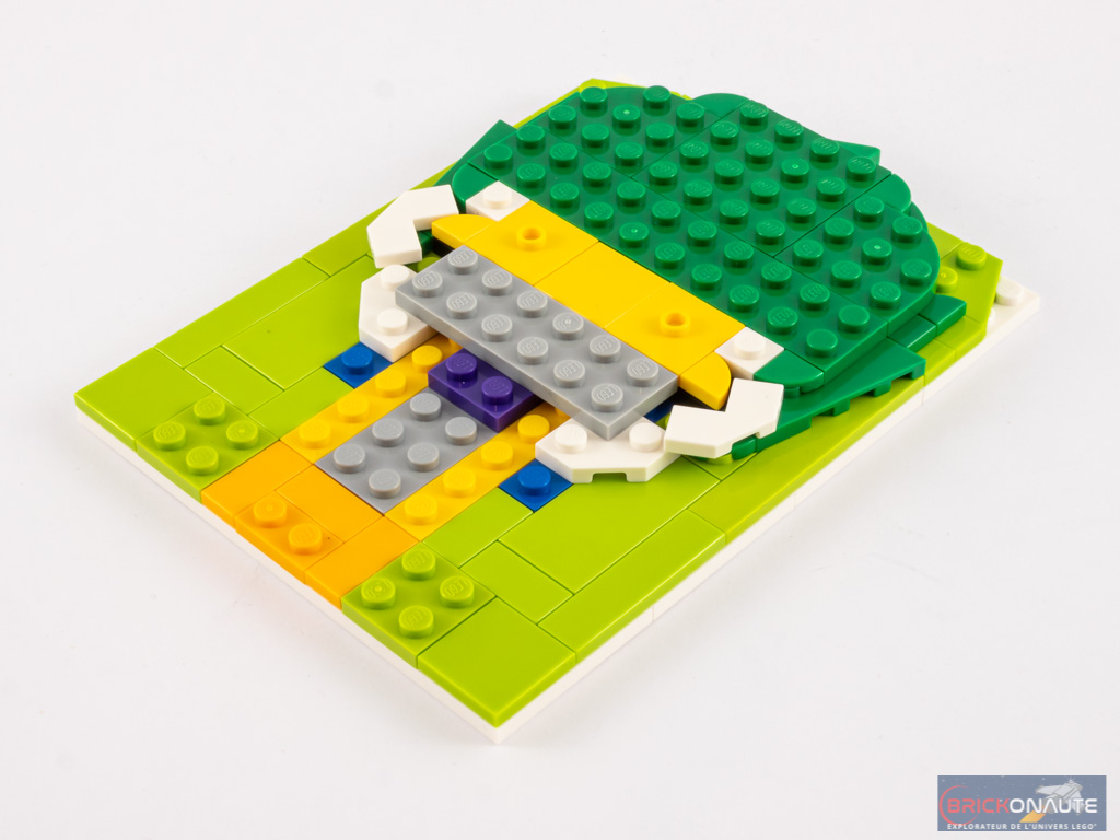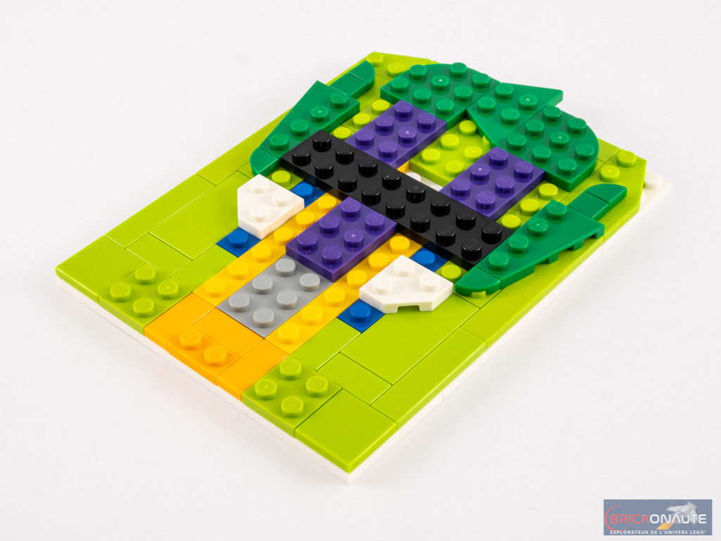 Et cette fois-ci, je trouve encore une fois le design franchement réussi. Les proportions du visage, tout en longueur, le fond des yeux jaune et un regard sournois accentué par deux plates recouvertes de sourcils courbés, les dents couleurs cool yellow qui tranchent avec le rouge des lèvres et le blanc du visage, le sourire accentué par ces petites tiles rouges et la partie basse de la bouche légèrement en retrait… il ne manque rien à ce Joker pour en faire, à ce stade de mes tests, la meilleure de Brick Sketches. Un seul petit regret, inhérent aux couleurs employées : on remarque une légère variation de teintes entre les pièces couleur lime qui constituent le fond du « tableau ».