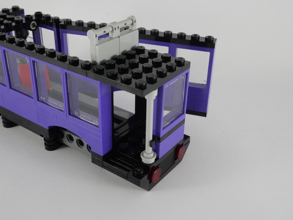 Quand on parle d’un véhicule LEGO et de jouabilité, celui-ci possède nécessairement une qualité première : il roule. Le designer a ajouté quelques « fonctions » supplémentaires : un lit au niveau bas, posé sur des « rails », de sorte à pouvoir bouger au gré des freinages et accélérations du chauffeur, ou un lustre articulé sur un pin Technic. On notera également la possibilité d’ouvrir le côté du bus, et de retirer le 3ème niveau, ce qui rend (un peu) plus facile l’accès à l’intérieur. Le bus étant assez étroit, ça reste assez compliqué tout de même. Le lit « mouvant » était également une bonne idée, même si Harry ne s’y installe pas lors de son trajet à bord du bus. Dommage que la « course » qui lui est allouée soit plutôt courte, et que la position prise par Harry soit… étrange. Enfin, il est impossible de placer le contrôleur debout, ailleurs que sur la dernière marche : il est trop grand.