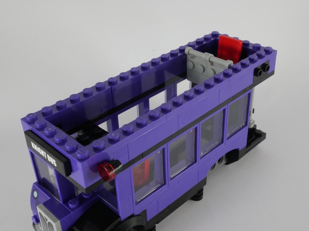 On passe alors au deuxième sachet de pièces, qui commence par l’aménagement arrière pour fermer l’ensemble construit précédemment. Une partie du plancher du second niveau est construite, qui dispose d’un unique siège à l’arrière. Le reste est ouvert, comme dans la Magicobus original. On repasse alors sur l’avant avec l’ajout des feux de gabarit et d’une tile décorée d’un autocollant « Knight Bus ». On termine ce second niveau avec l’ajout des fenêtres, de tiles pour recevoir le 3ème niveau, et de quelques pancartes. Une fois n’est pas coutume, on assemble les roues avant la fin de la construction du véhicule, puis le lustre articulé sur un pin Technic.