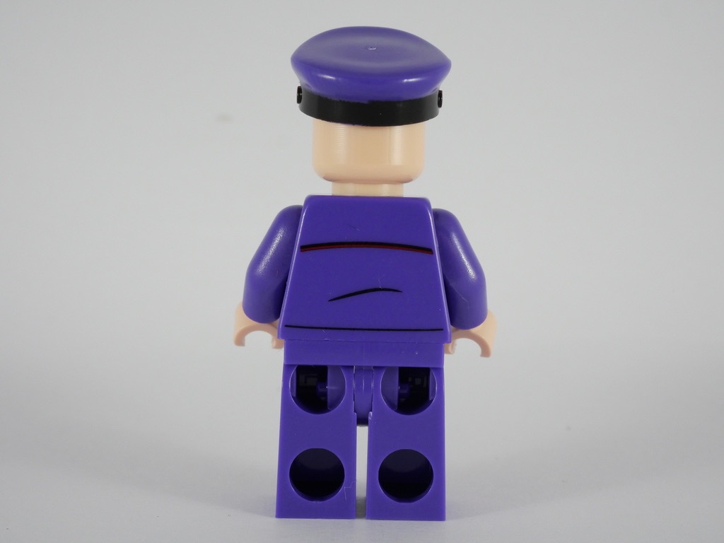 C’est, à mon goût, le personnage le plus réussi de la boîte. Son uniforme est de la couleur du Magicobus, medium lilac. Le pantalon est monochrome, et la tampographie du torse est joliment réalisée avec notamment la machine à billets autour de son cou. Il porte également une jolie casquette, de la même couleur, avec une bande rouge au niveau du front.
