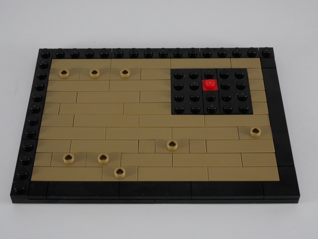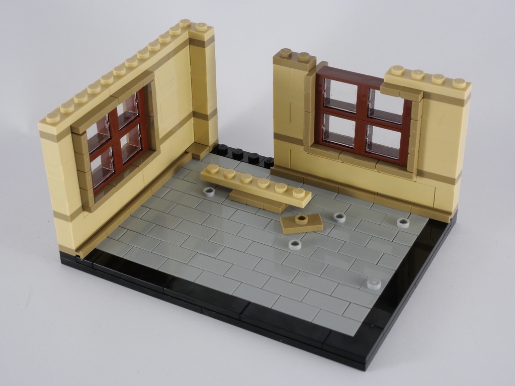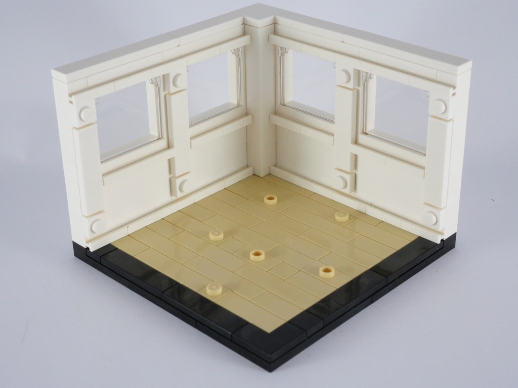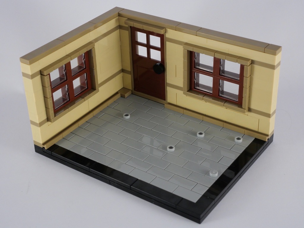 La deuxième saynète nous fait un peu avancer dans l’histoire de LEGO. La base fait exactement les mêmes dimensions que la précédente. Cette fois, c’est un carrelage couleur light bluish gray qui décore le sol. On utilise la même technique pour les plinthes (les door rails) avant d’élever les murs couleur tan également. La conception des fenêtres est intéressante : grâce à des techniques SNOT (pour Studs Not On Top), on leur constitue un cadre complet. On ajoute alors une porte, et une rangée de tiles couleur dark tan avant de passer à l’aménagement intérieur.