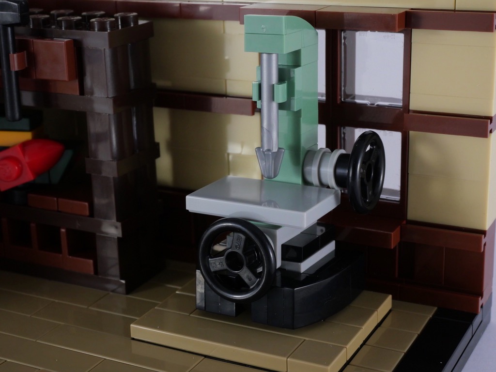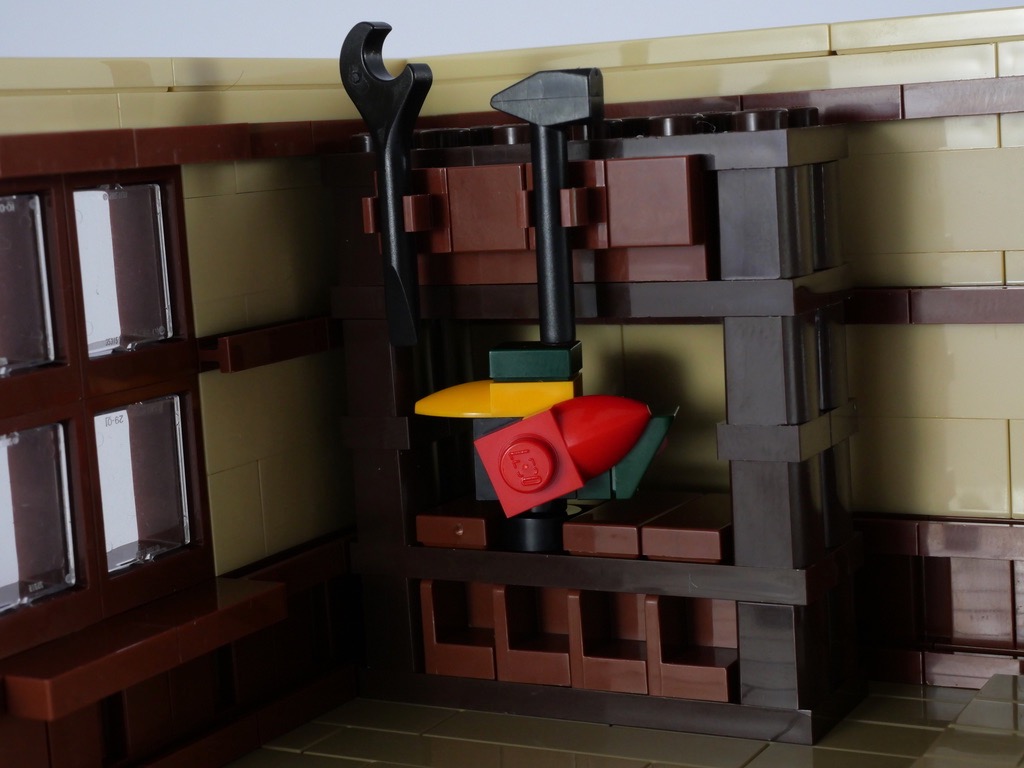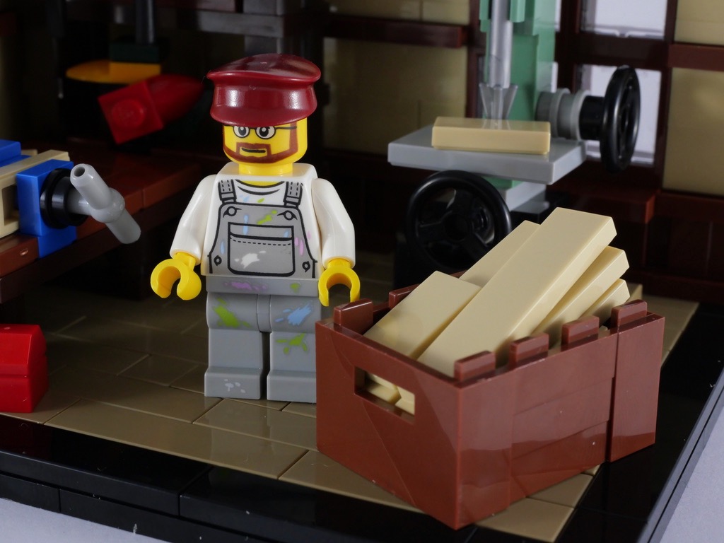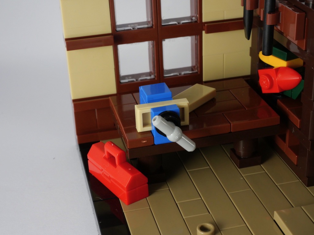 Vient alors le moment de meubler tout çà. On commence par une étagère, où trône le fameux canard en bois qui fut l’un des tout premiers jouets LEGO. Des outils de travail sont accrochés à cette étagère. On continue avec un banc de sciage, dont la construction du socle est très ingénieuse. L’établi est alors construit avec son étau, avant d’ajouter une caisse à outils et quelques planches de bois.