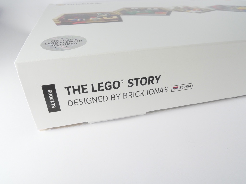 Sur le côté, on trouve le nom du projet (The LEGO Story), sa référence (BL19008), le nom de son designer (BrickJonas) avec le drapeau et le nom de son pays (la Serbie), le nombre de pièces différentes (271) et le nombre total de pièces (1442). De l’autre côté, on trouve la mention « AFOL Designer Program – Hosted by Bricklink ». Enfin, on trouve au dos une vue de détail sur les 4 saynètes proposées.