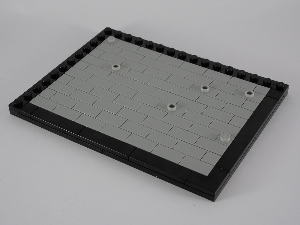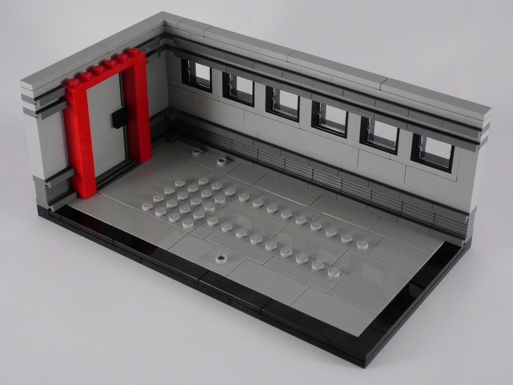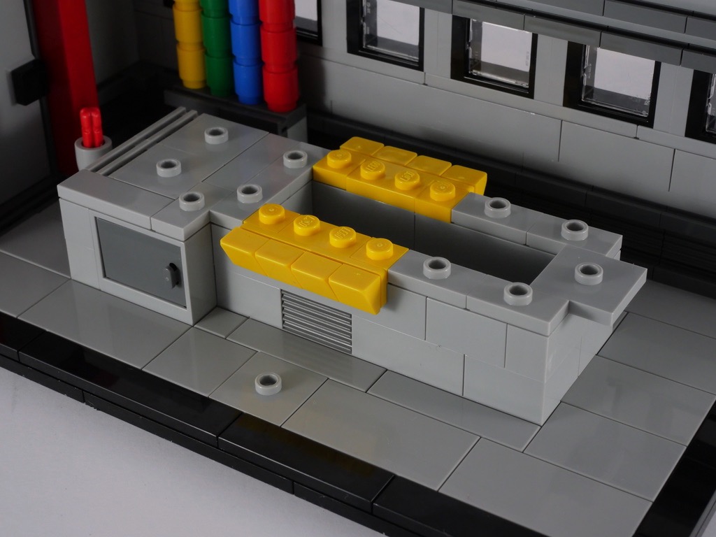 C’est la quatrième et dernière saynète du set, et c’est aussi la plus grande : 12×22 tenons. La base est ici carrelée de grandes tiles couleur light bluish gray : l’auteur a certainement voulu représenter le sol bétonné de l’usine de production. Le choix des couleurs pour les murs (light et dark bluish gray) et les textures employées collent parfaitement au contexte industriel. La construction des fenêtres est, ici aussi, très intéressante : elles sont posées « couchées » sur des tiles et maintenues en place par des briques SNOT. On ajoute une porte et son entourage rouge, puis une rangée de tiles achève, comme pour les autres vignettes, la construction des murs.