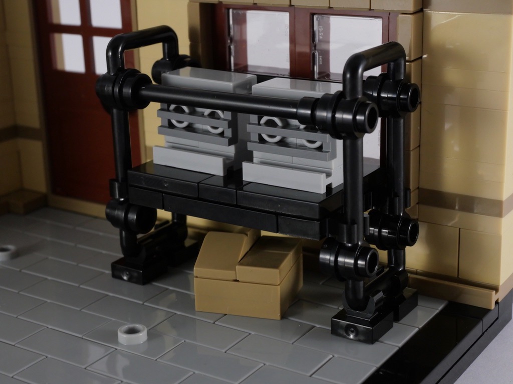 C’est la plus petite des saynètes, d’une dimension de 12×12 tenons. La base est décorée de tiles couleur tan, qu’on imagine être un parquet également avec ses joints décalés. Les murs de couleur blanche présentent des briques SNOT sur lesquelles sont attachées des plates et tiles qui donnent un peu de relief à l’ensemble. Le designer a fait le choix de fenêtres battantes pour ce troisième élément.