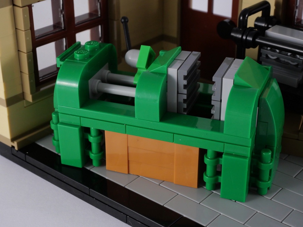 Pour commencer l’aménagement intérieur, on ajoute 4 tubes colorés identiques à ceux qui sillonnent les usines de production et acheminent le plastique ABS jusqu’aux machines d’injection. Un tuyau gris relie ces tuyaux à la machine proprement dite qui occupe la majeure partie de l’espace disponible. Il faudra être vigilant et précautionneux lors de la construction de cette machine : je m’y suis repris à plusieurs fois pour assembler le tuyau d’arrivée de l’ABS. Tous les détails sont là : le pupitre de commande, les vitres qui permettent d’apercevoir les moules à l’intérieur de la machine, et le tapis de convoyage qui emmène les pièces fabriquées dans une grande caisse. C’est sublime, et très intéressant à construire.