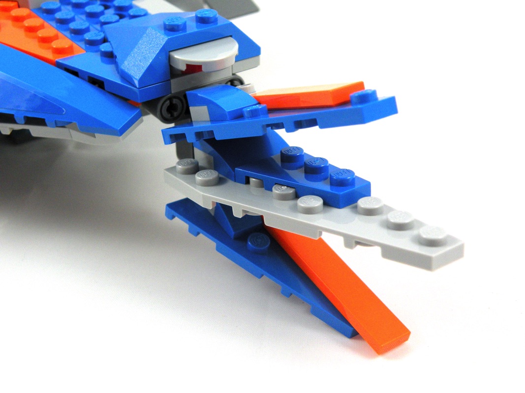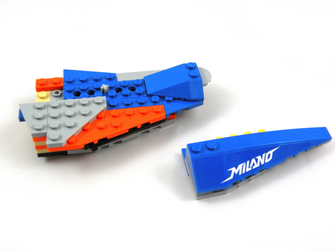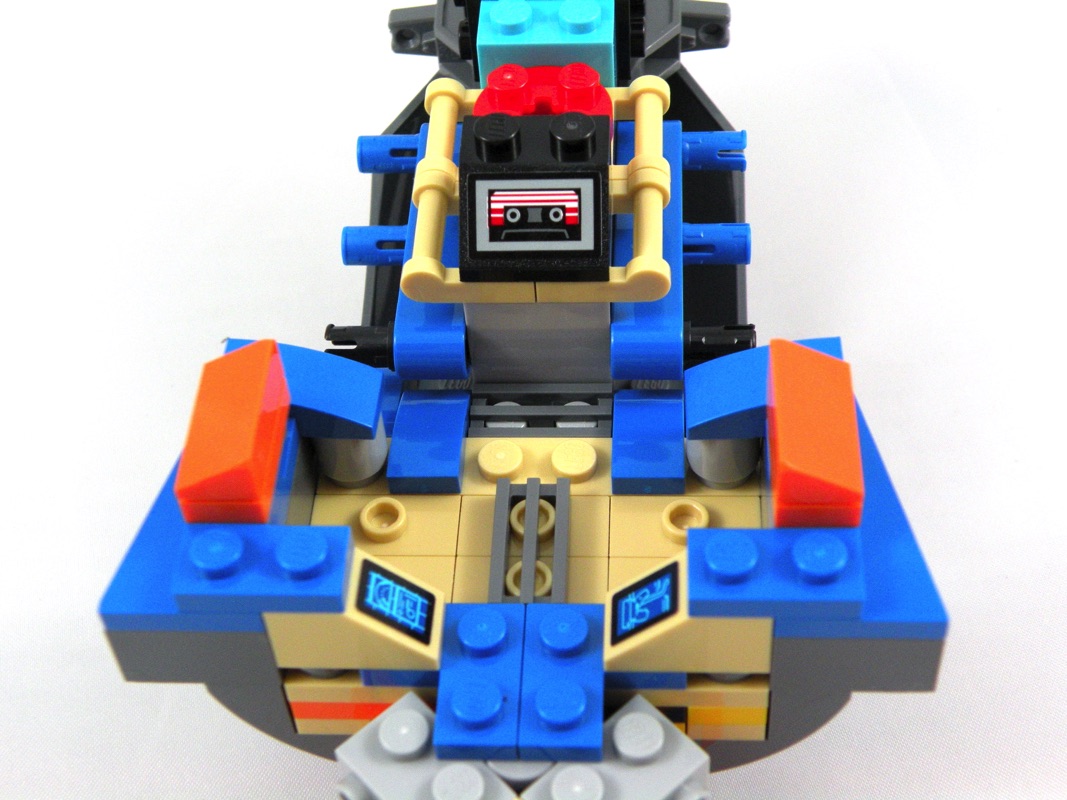 On continue le montage en assemblant l’avant du vaisseau et ses quelques stickers, notamment à l’aide d’une belle pièce Wedge 6 x 8 Pointed Cutout.On aménage également l’intérieur du cockpit avec le petit détail qui tue : la cassette audio de Star-Lord et ses tubes indémodables des seventies. Le mélange des couleurs (Orange, Blue, Tan, Light Bluish Gray et Dark Bluish Gray) fonctionne plutôt bien malgré l’aspect flashy au premier abord.
