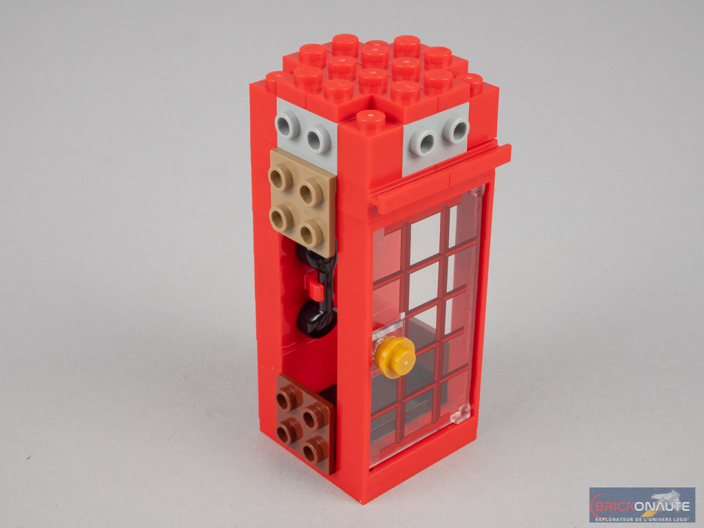 La construction commence logiquement par le moyen utilisé par Harry Potter et Arthur Weasley, la première fois qu’ils entrent au Ministère de la Magie : une cabine téléphonique. La conception est assez simple : une porte (joliment tampographiée) et un mur de briques, les deux autres murs étant constitués de tiles fixées sur des brackets – permettant de laisser de la place à l’intérieur. Au-dessus, quelques slopes lui donnent sa forme définitive, et 4 tiles blanches sont décorées d’un autocollant « telephone ».