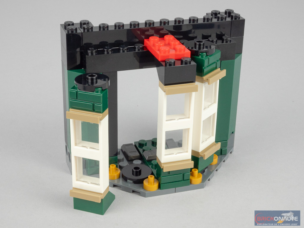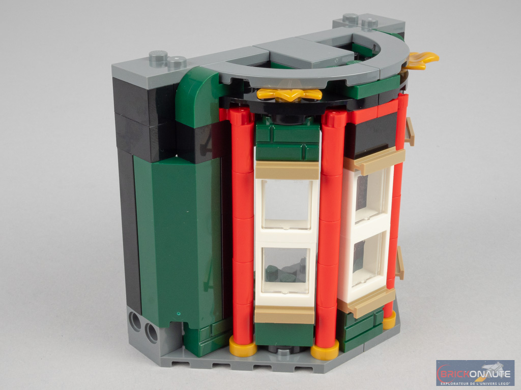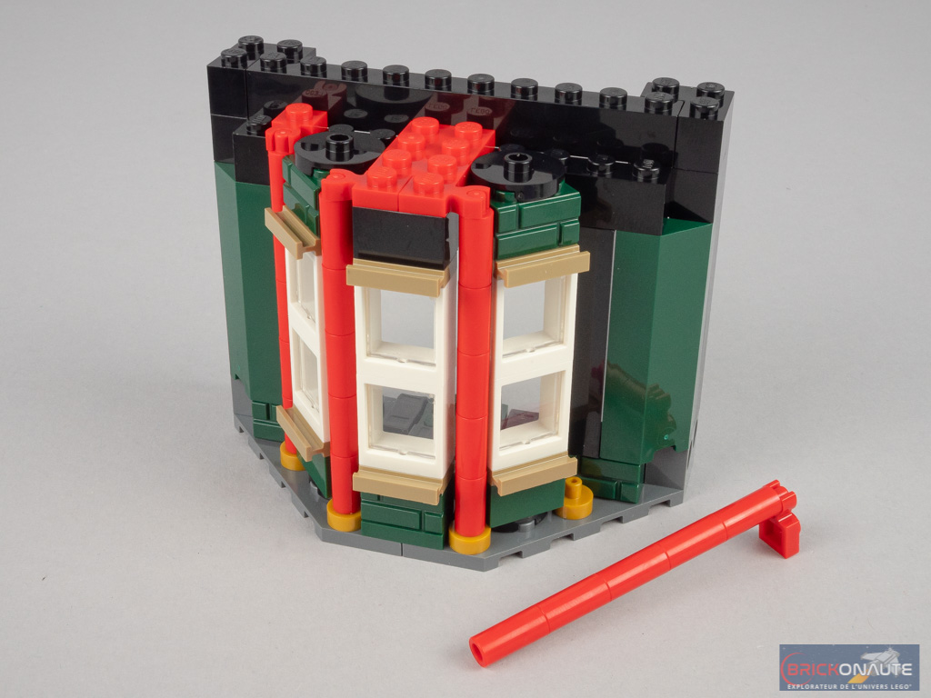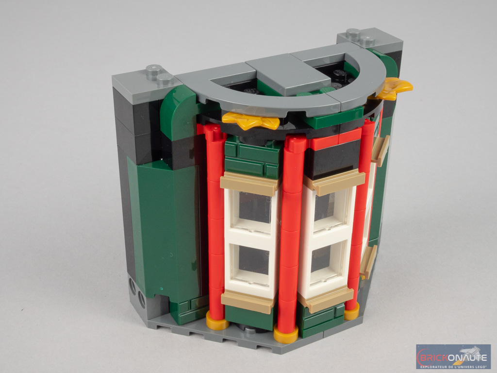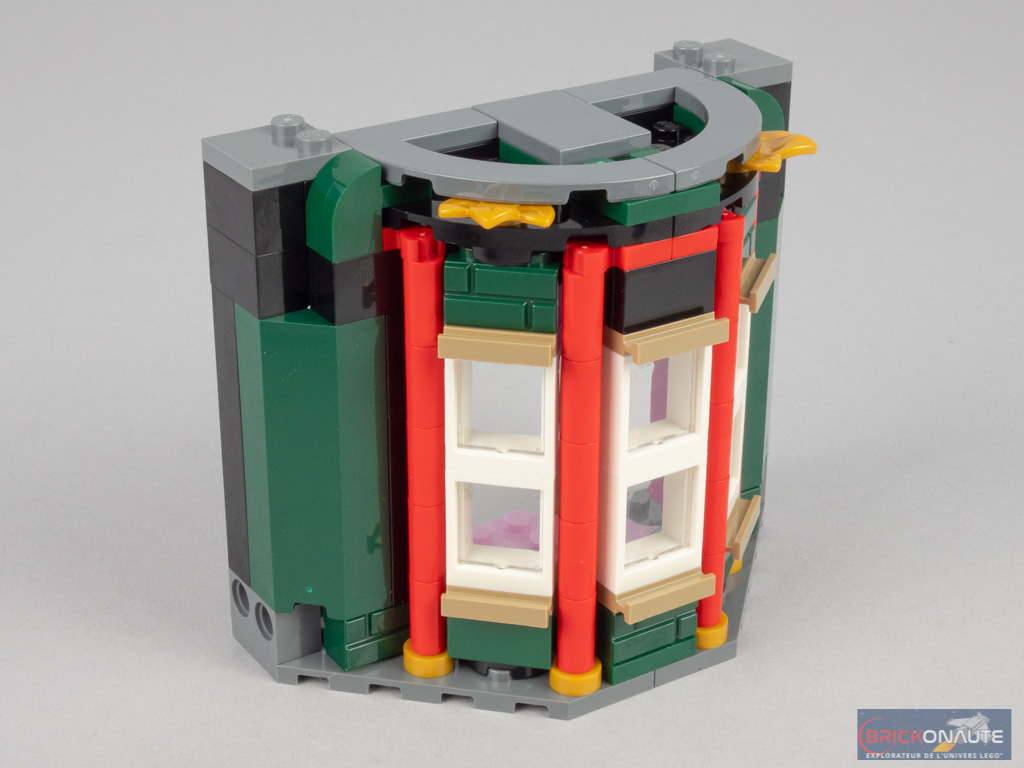 Le revers de la médaille de cette conception, c’est que l’ensemble n’est pas vraiment passionnant à construire : 4 modules sont identiques, et seul l’aménagement intérieur varie. Mais on pouvait s’en douter étant donné le bâtiment choisi. La conception de l’extérieur reste néanmoins intéressante, reprenant les techniques vues pour le bow-window du set 10270 Bookshop – à base d’éléments fixés sur un seul tenon pour obtenir l’angle désiré, et de colonnes constituées d’éléments de bougie pour combler les vides.