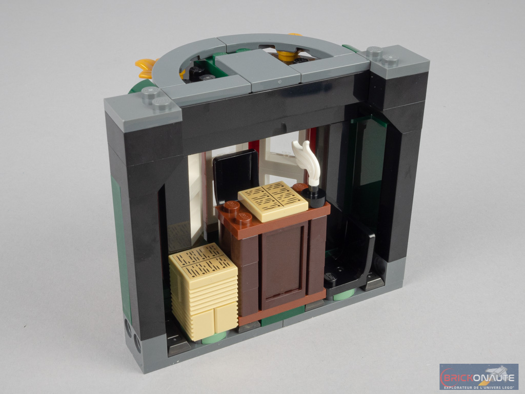 C’en est donc terminé des modules, on s’attaque enfin à la construction des toitures et de l’élément central qui les relie. On commence par cet élément central, décoré de quelques éléments dorés et en dessous duquel une barre permettra de clipser le grand drapeau orné du « M » du Ministère. Sur sa partie supérieure, on trouve une lampe de bureau et une machine à écrire. Les deux éléments de toiture reprennent la forme trapézoïdale des modules, surmontés de deux quarts de dôme et de barrières. Ils sont attachés au module central avec des pins Technic. Il sera donc possible d’inverser leurs positions si nécessaire, par exemple pour exposer le modèle vu depuis l’arrière tout en gardant un angle « fermé » entre les modules.