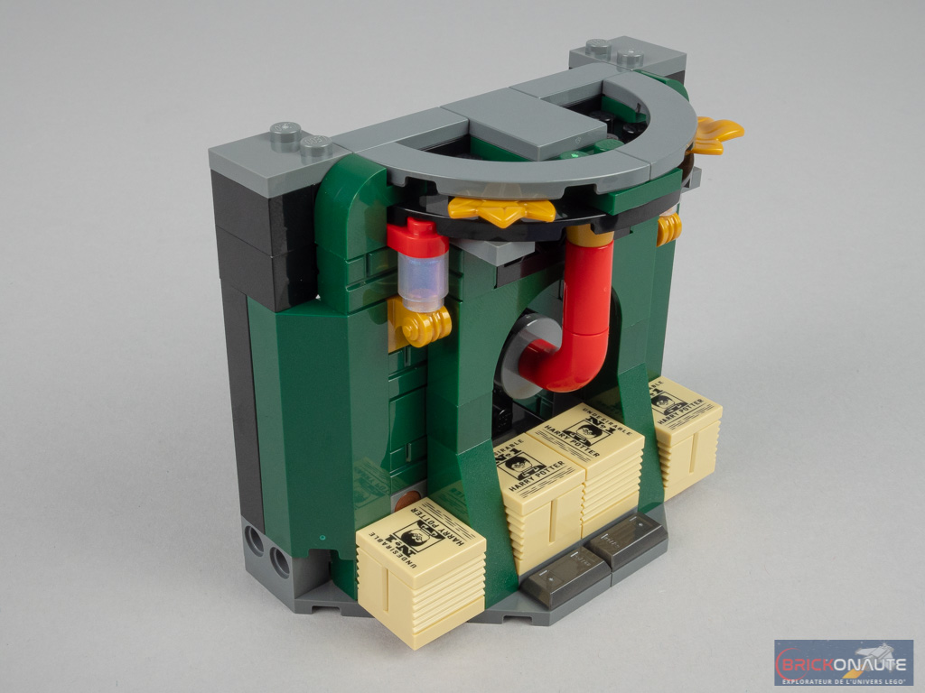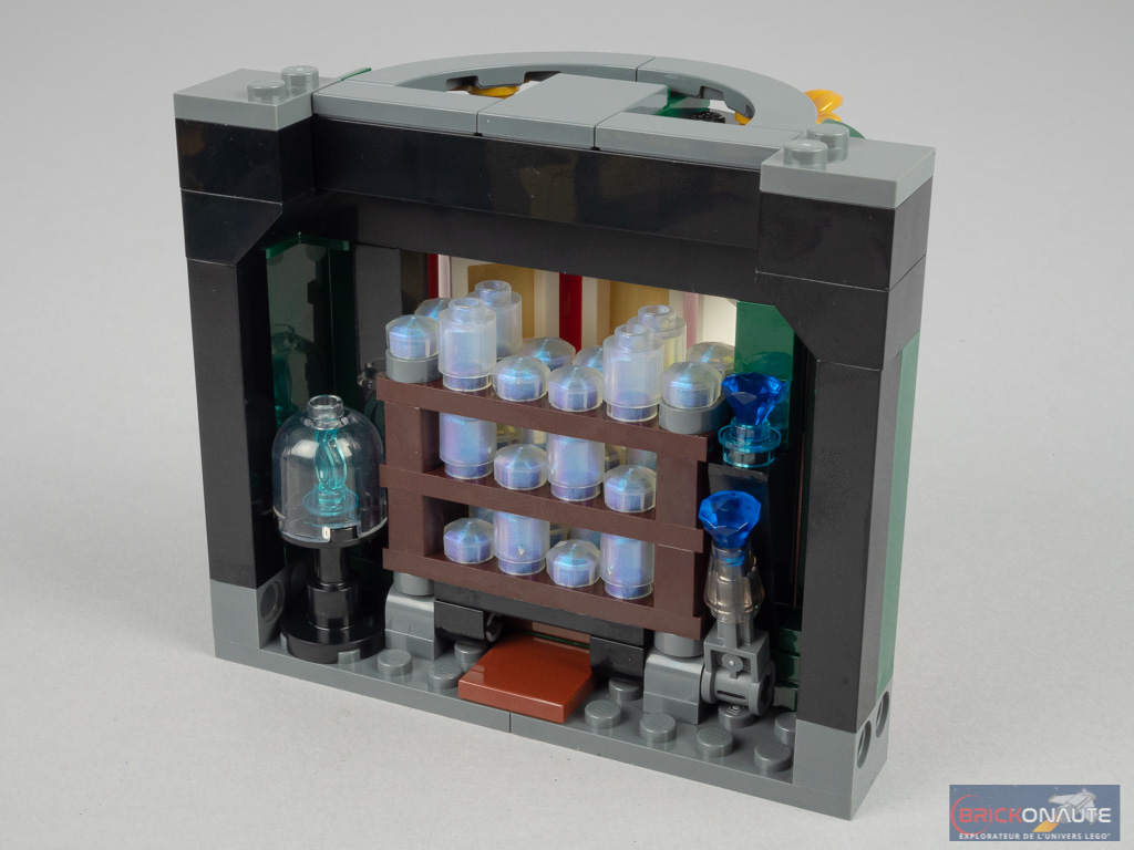 On reprend la forme habituelle pour le module suivant, qui ne varie des autres que par ses fenêtres : certaines sont masquées par des coupures de journaux. Côté intérieur, il s’agit de la Salle des Prophéties – représentées ici par des éléments couleur transparent opal rangés sur une étagère. Une étagère qu’il est possible de faire tomber avec un petit levier, pour reproduire la scène où l’armée de Dumbledore détruit plusieurs dizaines de prophéties pour se défendre contre les Mangemorts.