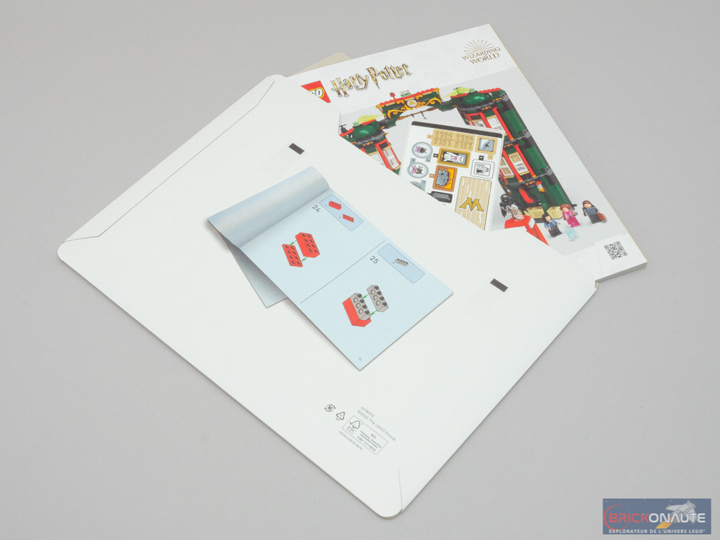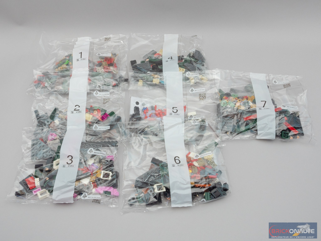À l’intérieur, nous trouvons 7 sachets de pièces numérotés, et une pochette en carton décorée, contenant la notice d’instructions et la planche de 15 stickers qui sont donc convenablement protégées. La notice d’instructions compte 128 pages pour 216 étapes de construction.