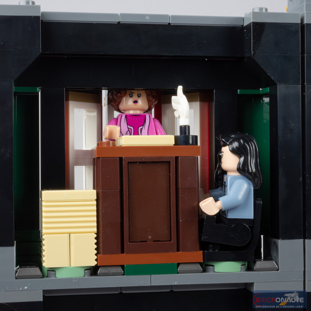 Pour rester sur ce sujet, la jouabilité semble ici à la hauteur. Outre la variété des intérieurs proposés, des minifigs et des mises en scène potentielles, on notera également quelques fonctionnalités comme une cheminée qui bascule (pour faire disparaître un personnage qui aurait utilisé la poudre de cheminette), des axes Technic permettant de faire voltiger des piles de journaux, ou des étagères de prophéties prêtes à être détruites par l’armée de Dumbledore.