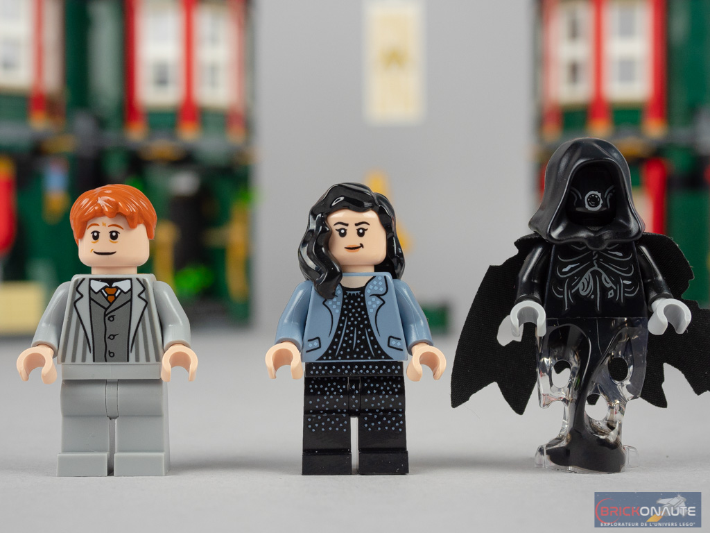Vous l’aurez constaté à la lecture du chapitre qui leur est dédié : une des grosses forces de cette boîte, ce sont les minifigs qu’elle contient. Parmi les 9 minifigs présentes dans la boîte, 8 sont exclusives à celle-ci. Et 6 représentent des personnages jamais vu jusqu’ici chez LEGO. Mais je crois qu’elles auraient mérité d’avoir des jambes plus travaillées, elles sont quasiment toutes tristement monochromes. Nos 3 héros sont présents sous une forme particulière : ils disposent d’un double visage et d’une coiffure de rechange, lorsqu’ils usurperont l’identité d’employés du Ministère pour s’y introduire et récupérer le médaillon de Serpentard – très intéressant en termes de jouabilité.