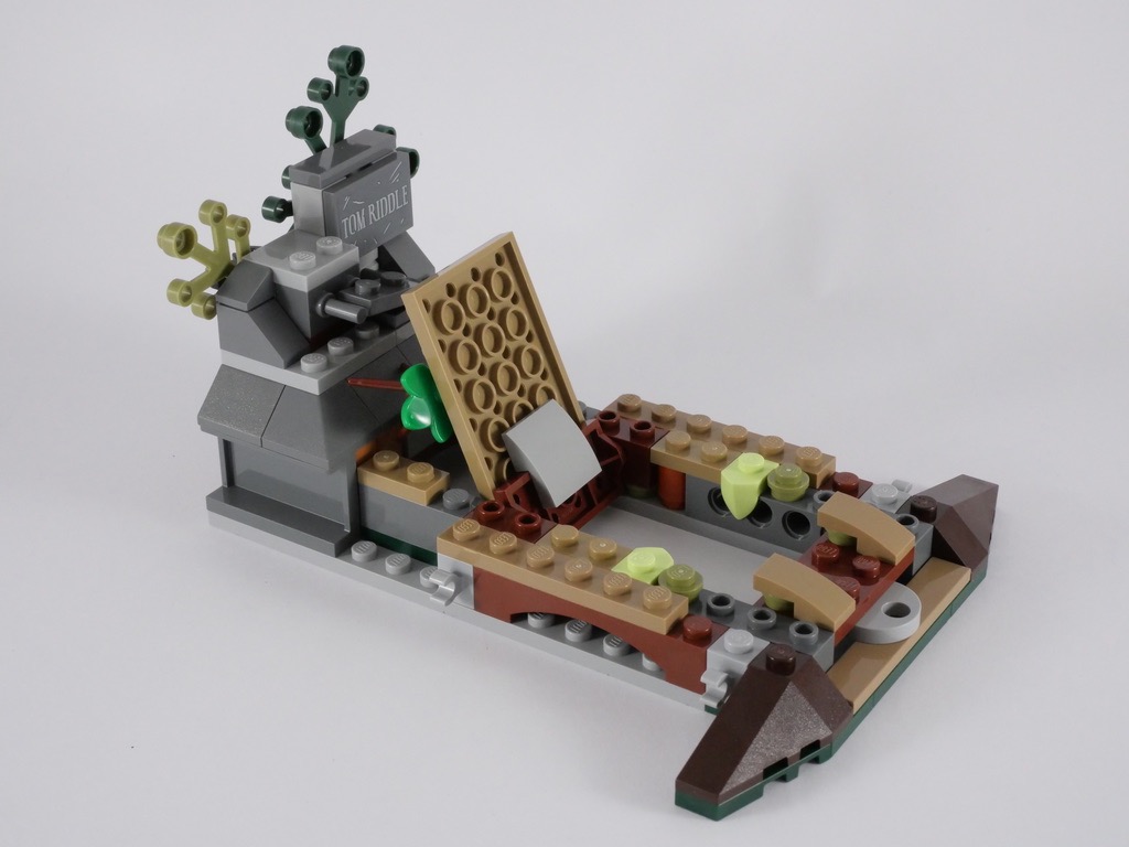 C’est plutôt rapide. Après avoir construit la coupe de feu (6 pièces) on s’attaque au cimetière proprement dit. On commence par assembler la stèle qui supportera plus tard la statue, on y place la tombe de Tom Riddle (Tom Jedusor). Deux feuilles décorent l’arrière de cette stèle. Puis on assemble le système permettant de faire apparaître Lord Voldemort. Celui-ci est constitué d’une trappe, articulée sur deux pins, et d’un support sur lequel placer la minifig de Voldemort. Lorsqu’on appuie sur ce support, la trappe se soulève et fait apparaître le grand méchant.