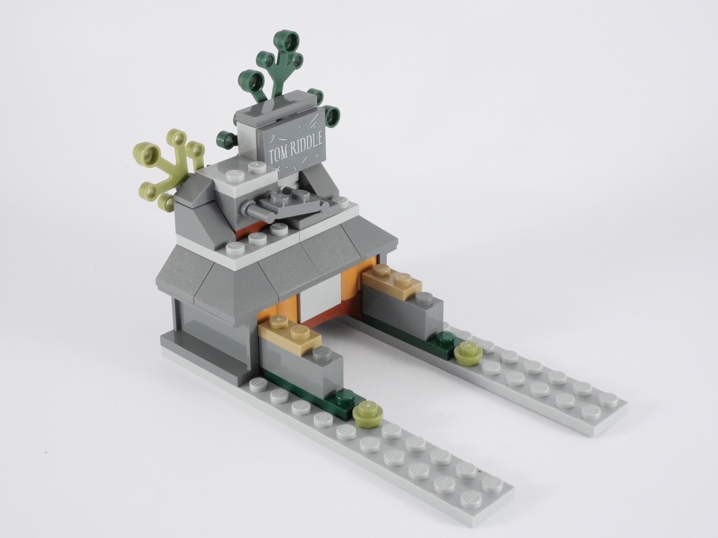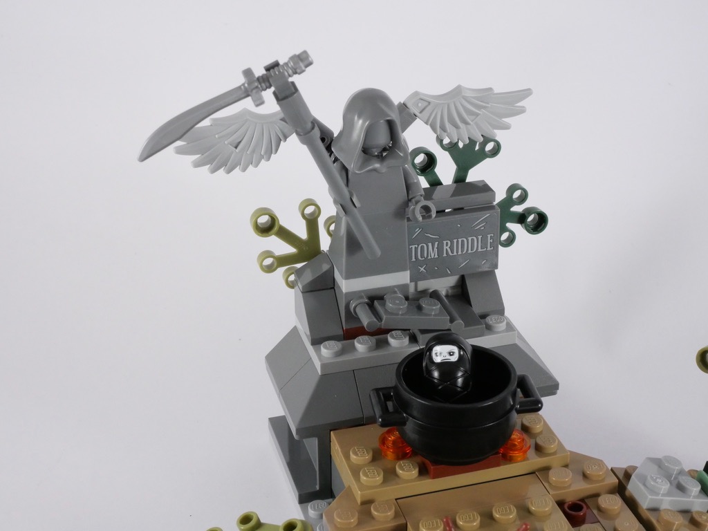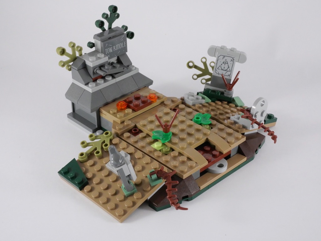 C’est plutôt rapide. Après avoir construit la coupe de feu (6 pièces) on s’attaque au cimetière proprement dit. On commence par assembler la stèle qui supportera plus tard la statue, on y place la tombe de Tom Riddle (Tom Jedusor). Deux feuilles décorent l’arrière de cette stèle. Puis on assemble le système permettant de faire apparaître Lord Voldemort. Celui-ci est constitué d’une trappe, articulée sur deux pins, et d’un support sur lequel placer la minifig de Voldemort. Lorsqu’on appuie sur ce support, la trappe se soulève et fait apparaître le grand méchant.