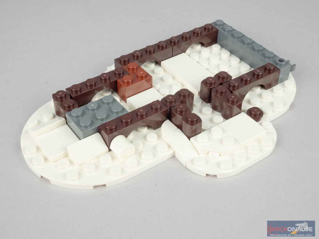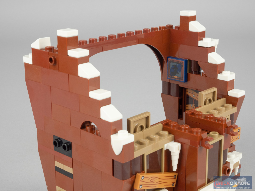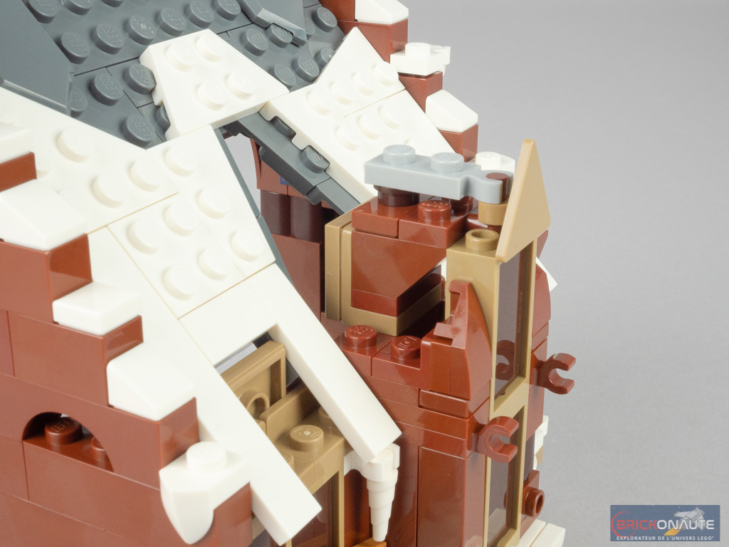 On attaque le 6ème et dernier sachet de pièces, avec lequel on élève les deux murs latéraux en « escalier », une grande arche « fermant » la partie arrière. On assemble ensuite le toit, fixé dans sa partie haute sur deux pins Technic permettant d’obtenir l’angle désiré en venant se poser sur la structure. On construit alors le chien assis, les pans latéraux étant cette fois-ci fixés sur des charnières. Un grande planche (un autocollant) vient barrer les deux fenêtres centrales. On termine la construction avec un second sous-ensemble de cheminée fixé sur le côté, puis on attache cet étage au-dessus du rez-de-chaussée.
