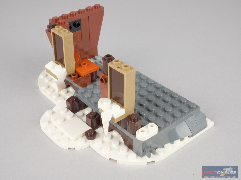 Nous continuons avec le rez-de-chaussée de la cabane hurlante, logiquement posé sur un socle enneigé. Il est légèrement surélevé, une petite marche permet d’accéder à l’intérieur. Les murs sont partiellement constitués de pentes inversées, renforçant le caractère « ruinesque » de la bâtisse. De la neige pend au bord des fenêtres, toutes condamnées par des planches qu’on vient fixer au-dessus. Il faudra s’armer de patience pour la porte : il faut y coller deux stickers, pas spécialement faciles à appliquer. Côté intérieur, on retrouve un coffre, un petit bureau avec un fauteuil et une lanterne, et une tile bleue avec un autocollant en guise de fenêtre.