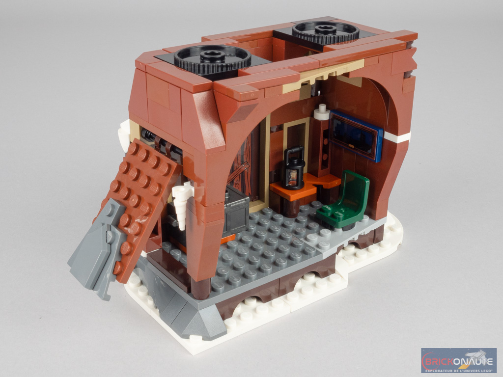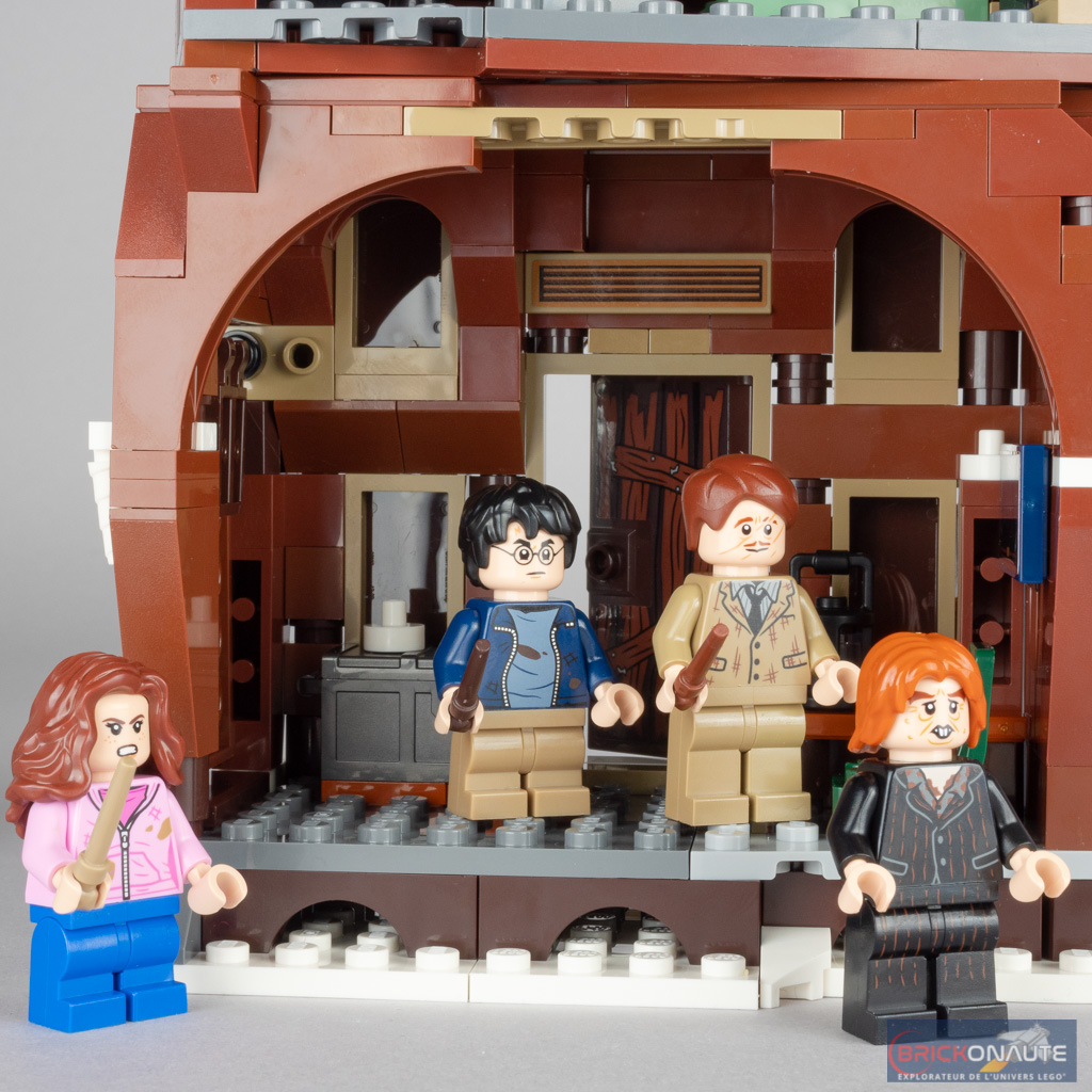 Côté intérieur, je retiendrai surtout le 1er étage – les amateurs y retrouveront le lit, le piano ou la cheminée vus dans le film, et l’espace offert est suffisant pour y placer quelques minifigs. Le rez-de-chaussée est un peu plus simple dans son aménagement – on y trouve quelques accessoires et un pan de mur mobile par lequel faire entrer les minifigs, une sorte de passage secret comme si elles arrivaient depuis la grotte dont l’entrée se situe au niveau du Saule Cogneur.