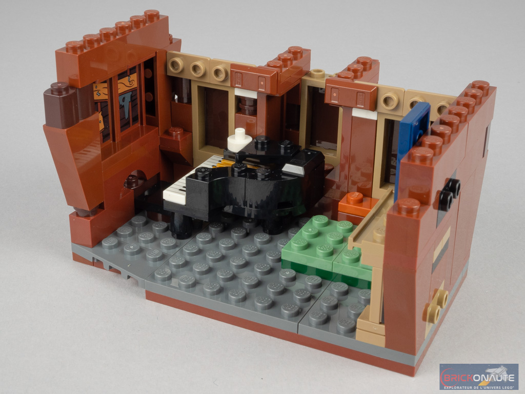 On passe ensuite à l’étage supérieur, assemblé séparément. Sa conception est similaire au rez-de-chaussée, si ce n’est l’avancée centrale obtenue avec de grandes slopes inversées. Côté intérieur, on trouve une cheminée, un lit et un piano – c’est dans cette pièce que se passe l’une des scènes principales et ça semble cohérent. On retrouve une tile bleue au mur, avec un autocollant représentant une fenêtre cassée.