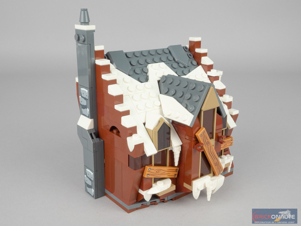 Alors qu’il s’agit d’une des scènes majeures du 3ème opus de la saga, la cabane hurlante n’avait été interprétée qu’une seule fois par LEGO, et il y a bien longtemps, avec le set 4756 Shrieking Shack sorti en 2004. Il était donc temps de la remettre au goût du jour, et je trouve que LEGO s’en tire encore une fois très honorablement. À commencer par la forme très particulière de cette dernière, fine en bas et qui s’évase à mesure qu’on monte dans les étages. Le tout surmonté par une toiture très pentue de laquelle dépasse une grande fenêtre sous un chien assis.