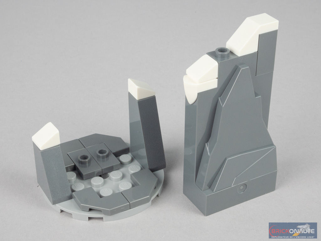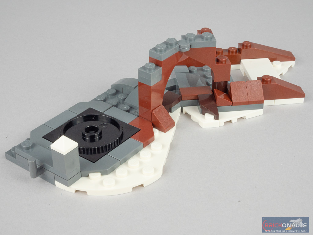 On s’attaque alors au Saule Cogneur – et plus précisément à sa base. Elle est en deux parties : la première comporte une turntable pour la fonction permettant à Rémus Lupin de se transformer en loup-garou, une plateforme tournante sur laquelle repose un rocher et une tige transparente supportant des nuages ou la pleine lune. De l’autre côté se situe le mécanisme permettant de faire tourner les branches du Saule Cogneur : un petit cadre noir comportant un axe Technic et un engrenage. Le cadre est légèrement incliné, rendant la liaison avec le tronc un peu fragile.