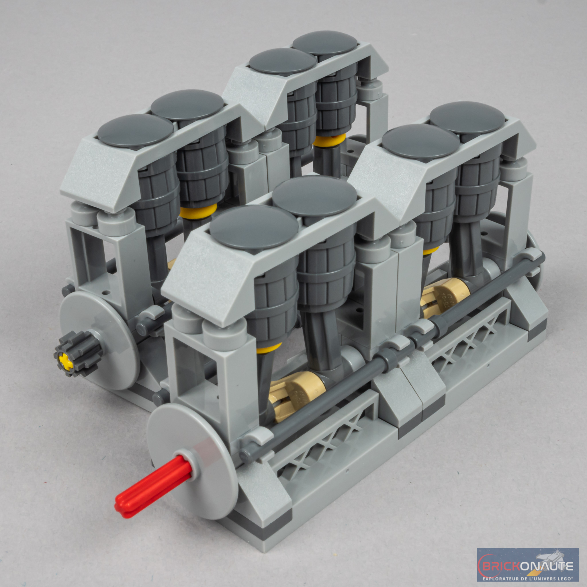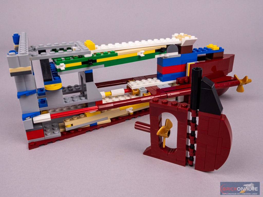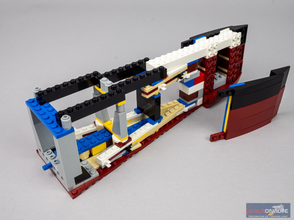 La section du bateau – du moins de sa coque – commence à se réduire sur cette section. On assemble ici une base de forme trapézoïdale sur sa partie arrière. En partie basse, un cylindre contient des engrenages et deux axes qui seront d’un côté connectés aux moteurs, de l’autre aux hélices. Il s’agit de la turbine basse pression entraînant l’hélice centrale. On élève la structure dans laquelle on intègre un assemblage à base de ball joints et de clips, permettant d’obtenir l’angle de coque désiré. Vers l’avant, ce sont des briques SNOT qui recevront la coque.