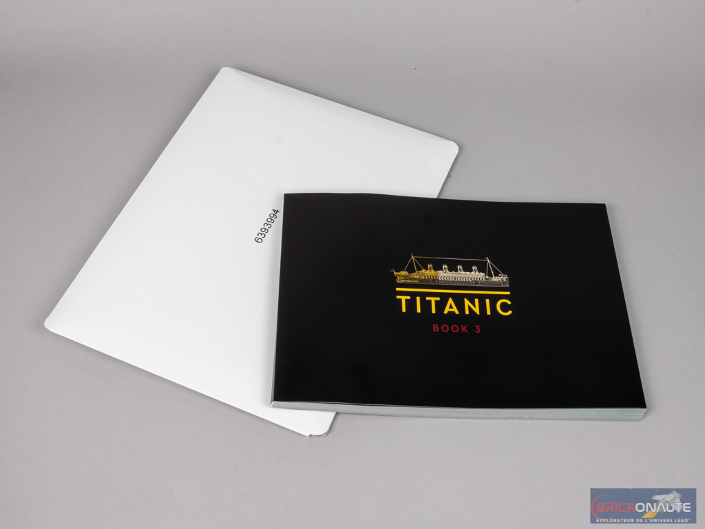 La première des trois « sous-boîtes » contenues dans le set nous propose la construction du tiers avant du navire. On retrouve d’ailleurs une représentation de ce premier tiers sur les deux faces de la boîte. À l’intérieur, on trouve 22 sachets numérotés de 1 à 12, ainsi que 3 tiges blanches. Dans une pochette cartonnée se trouve la première notice (260 pages pour 349 étapes de construction) ainsi qu’une petite planche en plastique souple avec 3 pavillons. On ne retrouve pas celui de la White Star Line.