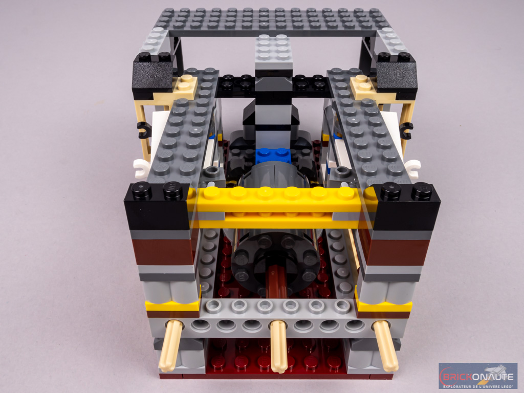 Cette première étape de la deuxième section vise essentiellement à construire la structure de la partie inférieure du bateau : une grande base rectangulaire, des cadres et des grandes briques en représentent la majeure partie. Du côté de la « coupe », on assemble tout de même les échelles d’accès au pont Orlop et deux passerelles métalliques. Les portes des fourneaux sont représentés par la partie inférieure de 4 angular bricks.
