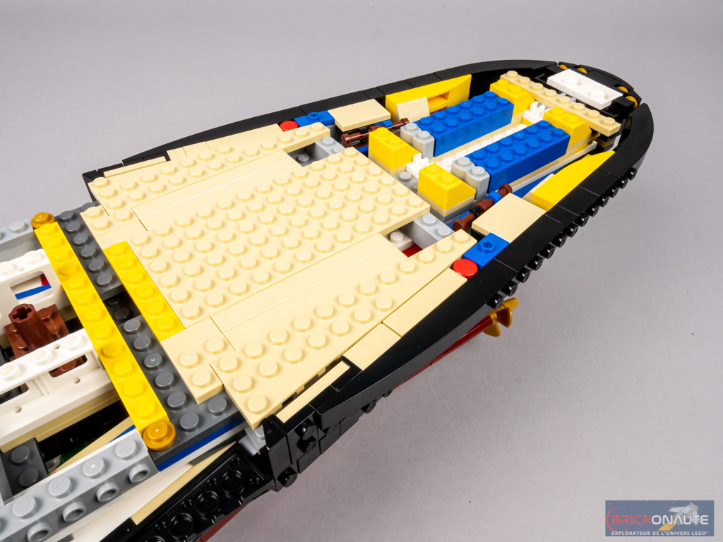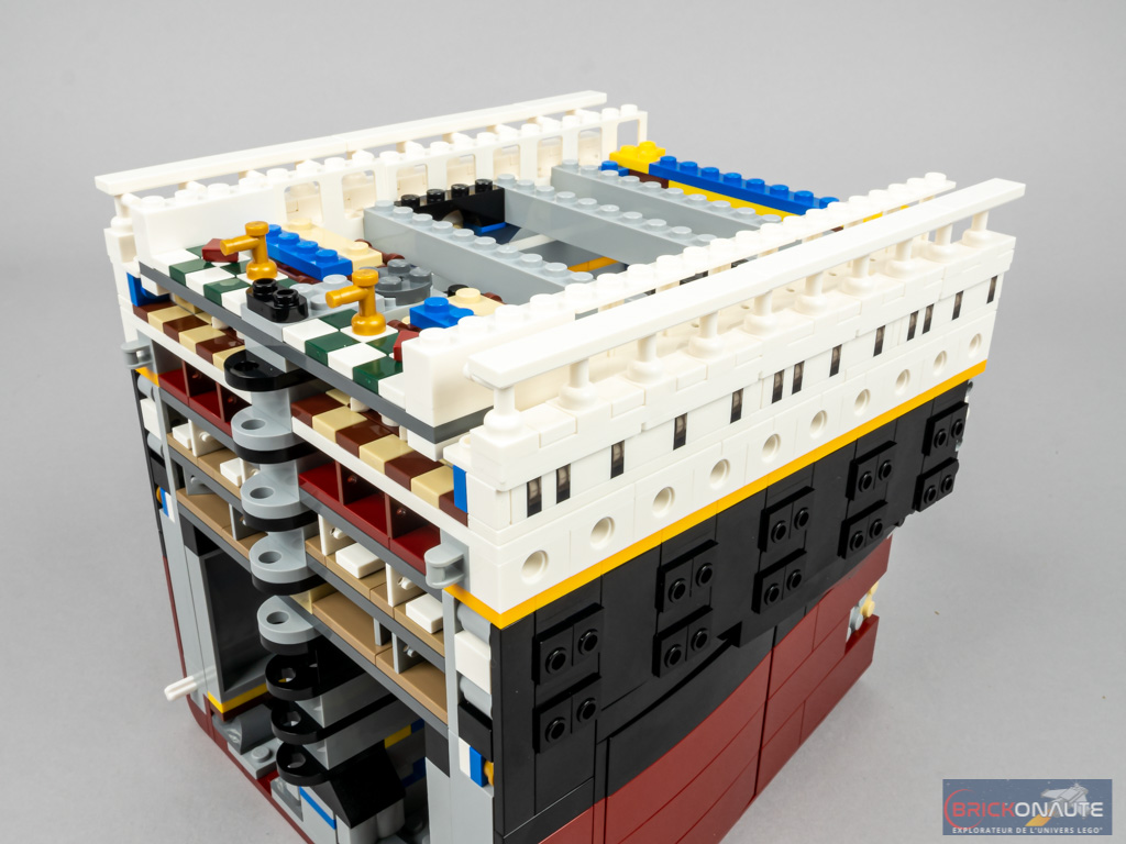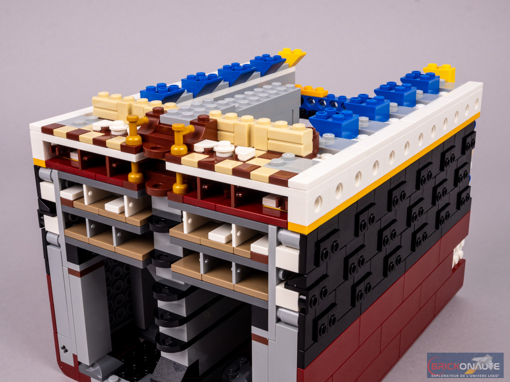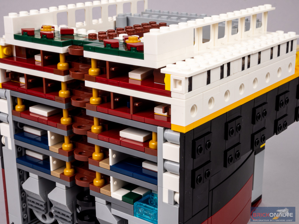 La rangée de hublots du pont C est constituée de briques Technic trouées. Au niveau du plan de coupe, on retrouve les planchers jusqu’au pont B. En partie inférieure, on devine qu’il s’agit de cabines. Plus haut, cela semble être les salons. On retrouve un grand escalier au niveau des ponts B et C.