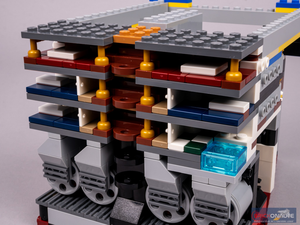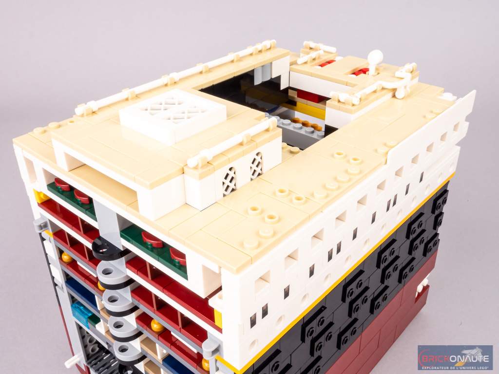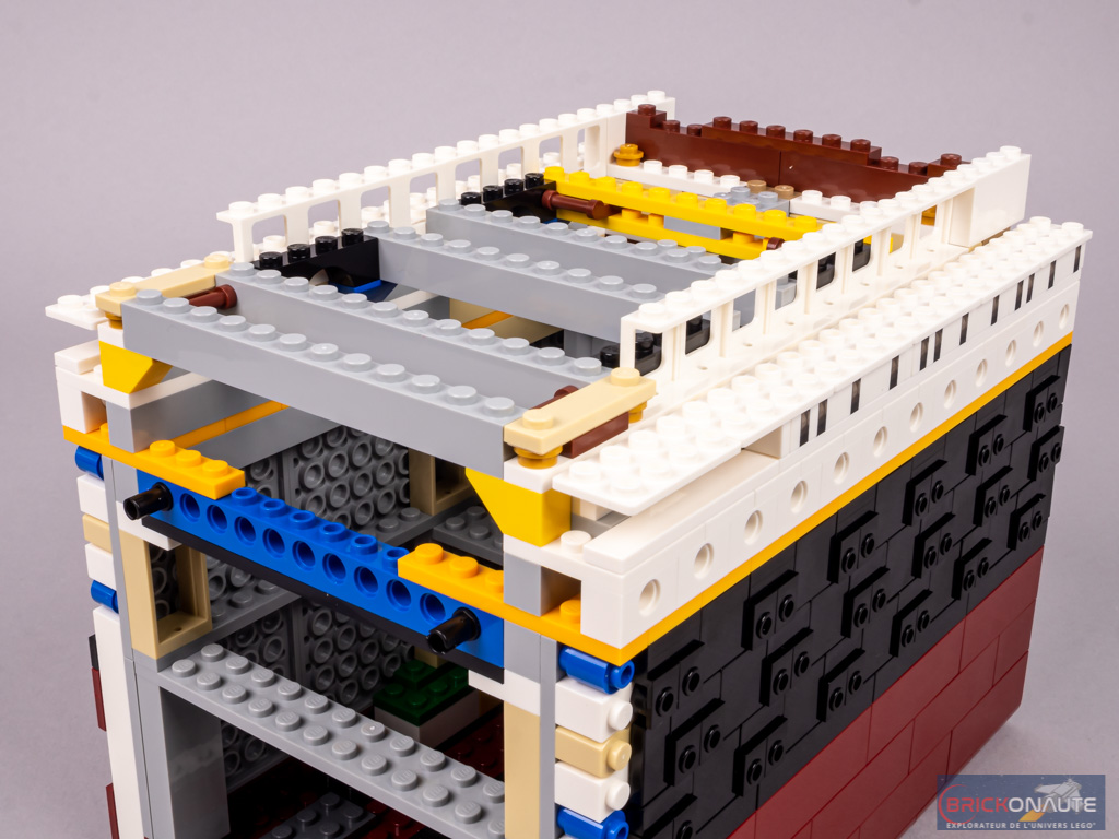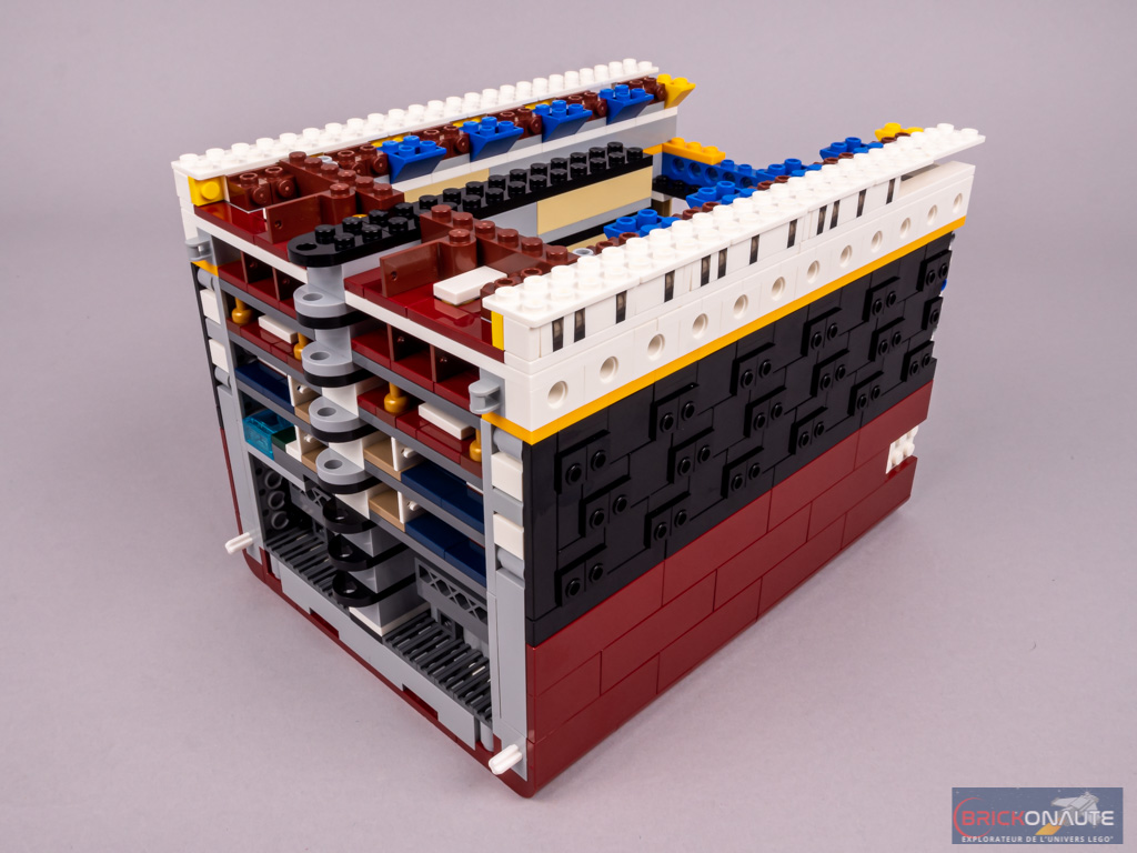 La rangée de hublots du pont C est constituée de briques Technic trouées. Au niveau du plan de coupe, on retrouve les planchers jusqu’au pont B. En partie inférieure, on devine qu’il s’agit de cabines. Plus haut, cela semble être les salons. On retrouve un grand escalier au niveau des ponts B et C.