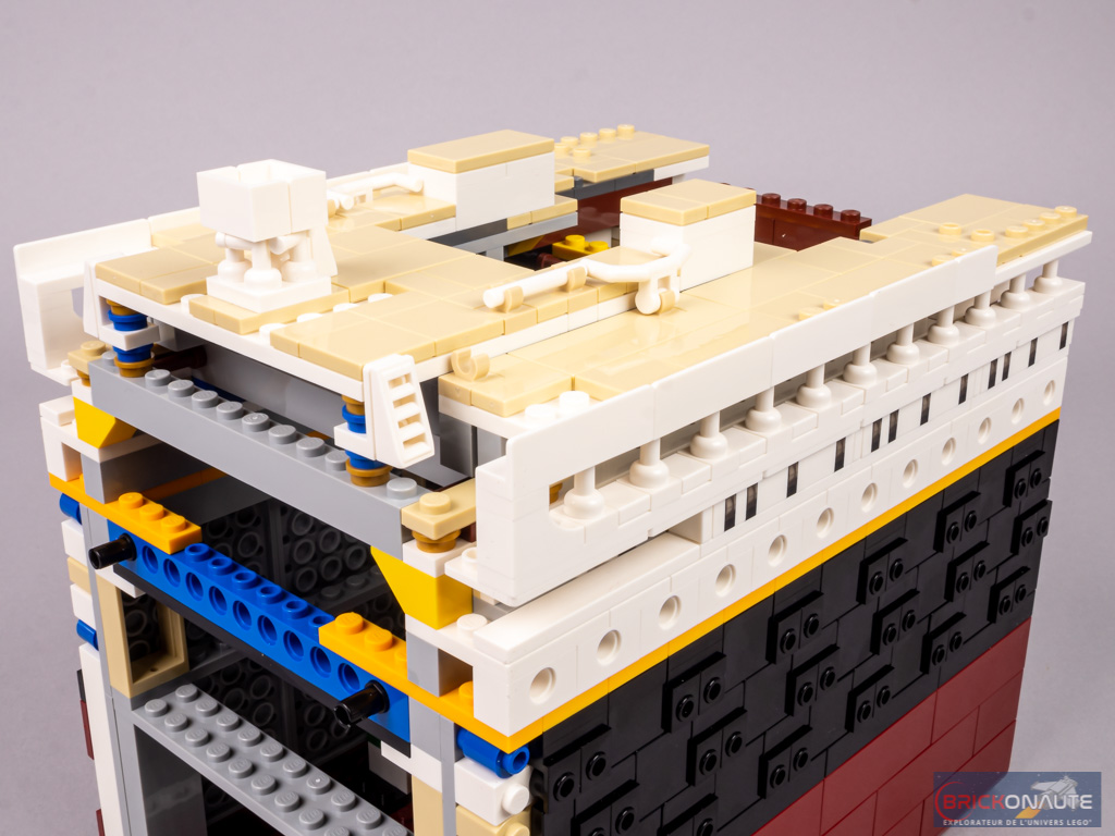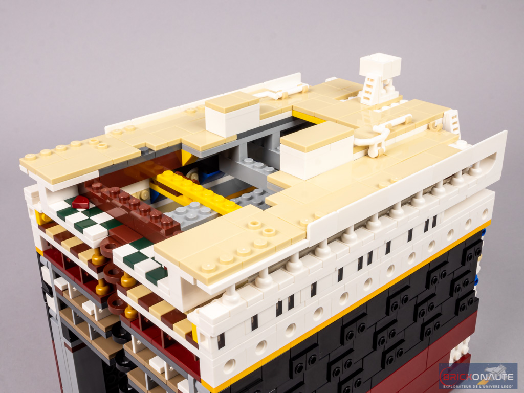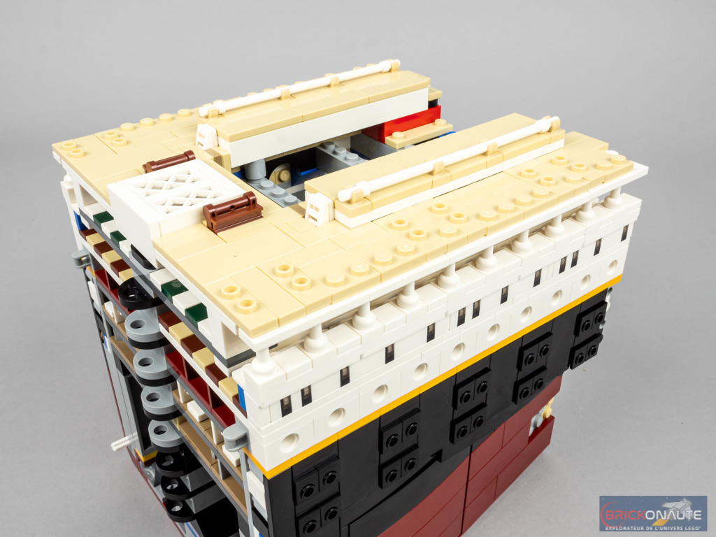 Nous continuons d’élever cette section du bateau en ajoutant le pont des embarcations, que l’on « pave » d’éléments couleur tan. Deux parties sont légèrement surélevés. Côté avant, il s’agit du puits de lumière au-dessus du grand escalier, se prolongeant sur tribord par le gymnase. Côté arrière, il s’agit du toit du salon des 1ère classe. Sur ces éléments, de petites barres blanches sont clipsées et représentent les différentes rambardes présentes à ce niveau.