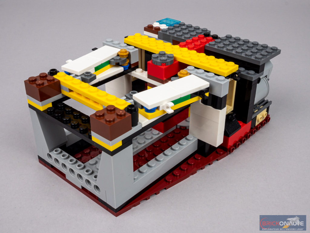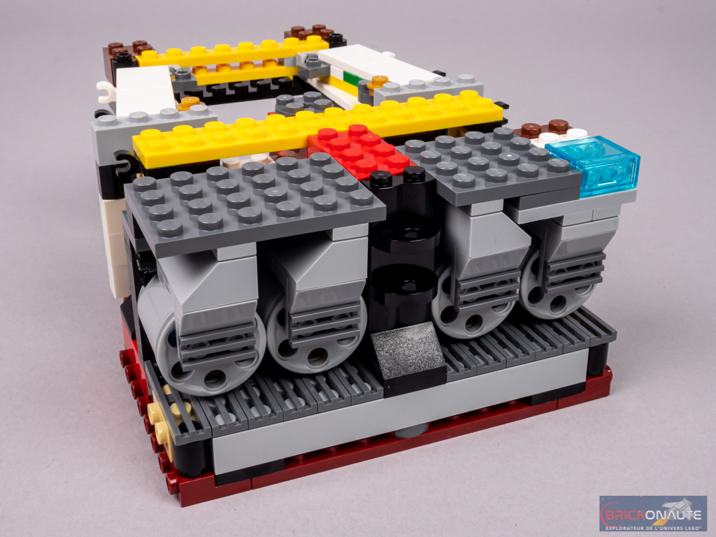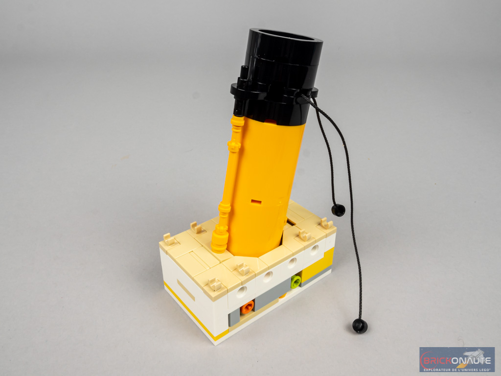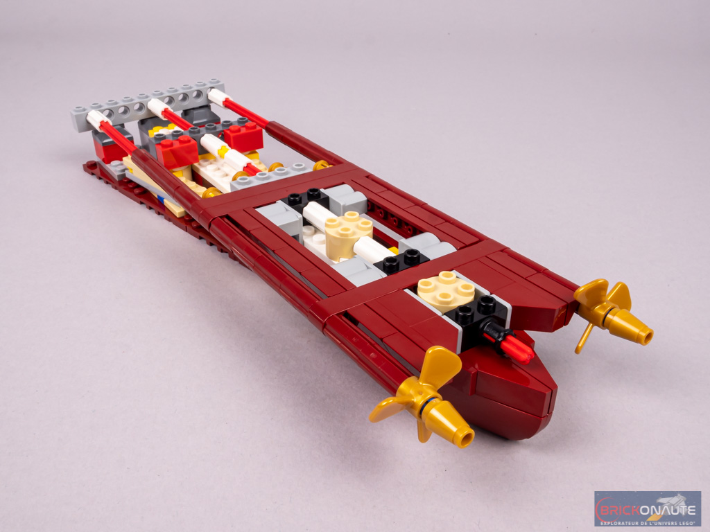 Et chacune de ces « sous-étapes » de construction offre un plaisir qui lui est propre. Pour la coque, on appréciera la manière dont s’imbriquent parfaitement les différents sous-ensembles, qu’ils soient directement fixés à la structure ou clipsés – c’est toujours diablement satisfaisant. Pour les petits détails, c’est la façon de détourner certains éléments de leur fonction initiale qui est très bien pensée et réalisée – avec des téléphones clipsés en guise de manches à air pour ne citer qu’un seul exemple. Bref, l’expérience de construction ne manquera pas de donner des idées à certains d’entre vous.
