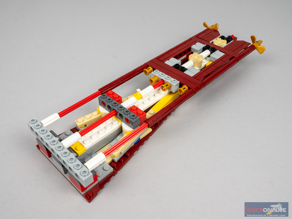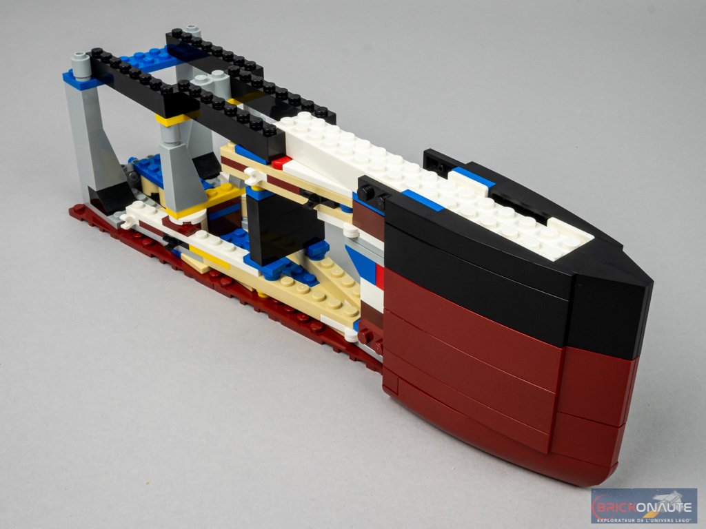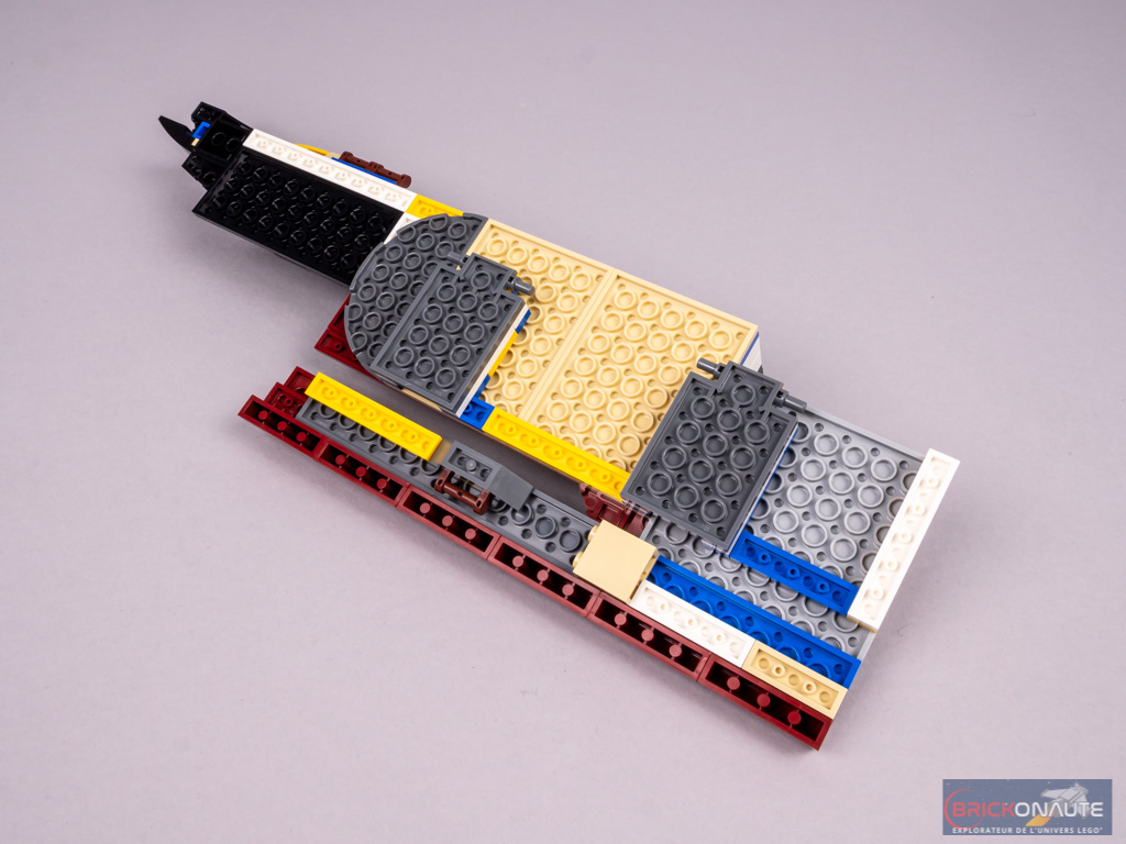 On commence cette dernière étape de la deuxième section en complétant la coque et le pont au niveau de la jonction entre les deux sections. Comme pour la section de proue, deux sous-ensembles de couleur reddish brown sont insérés dans la coque et servent de support d’exposition. On construit enfin un grand sous-ensemble comportant une partie de pont en partie supérieure, et un axe Technic en dessous. Une fois les deux premiers tiers du bateau attachés entre eux, on vient insérer ce sous-ensemble pour les solidariser.