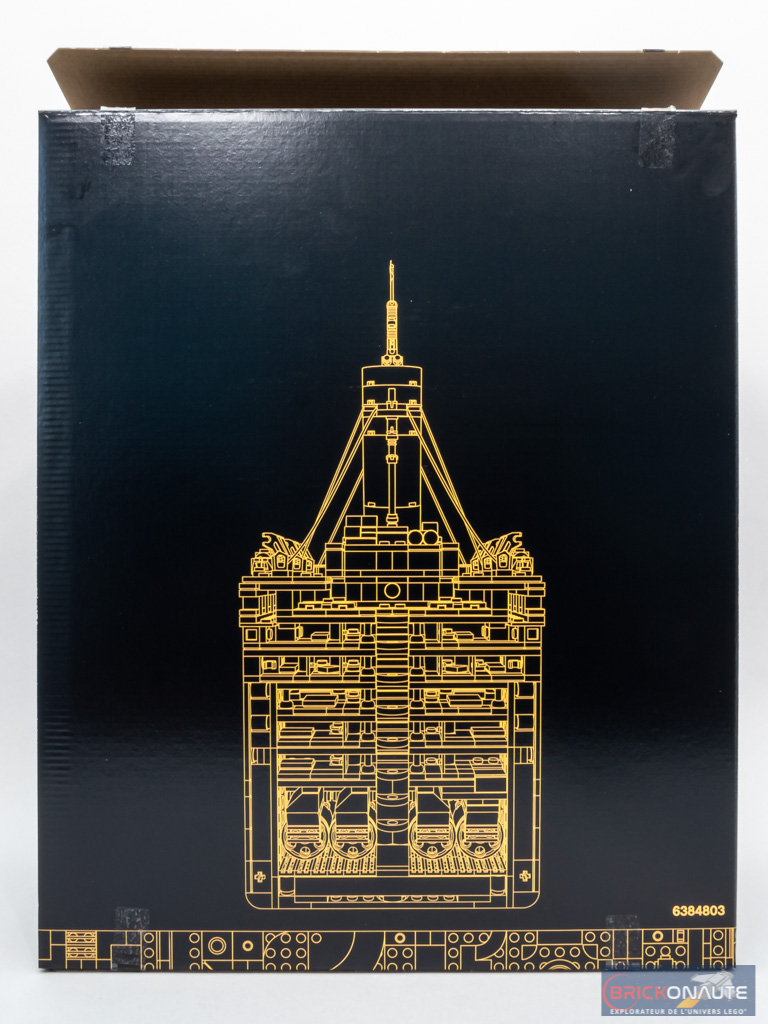 La face avant de la boîte est semblable à ce que LEGO nous propose désormais avec les produits dédiés aux adultes : le modèle, ici vu de 3/4 avant, sur fond noir avec une jolie police d’écriture pour le nom du set en lettres d’or. Un bandeau coloré en partie inférieure nous précise quelques informations : la référence (10294) et le nombre de pièces (9090), ainsi que la mention « 18+ ». Dans le coin supérieur droit, on en apprend plus sur les dimensions finales – et il faudra une grande étagère : 1,35m de long pour 44cm de haut, support inclus.